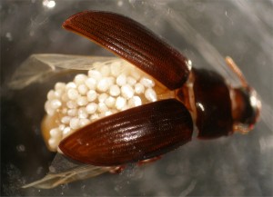 The mites seem to have limited effect on the beetles, as most parasites do. (After all, if a parasite kills its host, then it has lost its ‘meal ticket’!) However, over winter, mites can kill their hosts as they rest through the lean times. Once the warmth and wet of spring arrives, some infected beetles live long enough to mate with their offspring generation, and so the next lot of beetles is infected with mites.