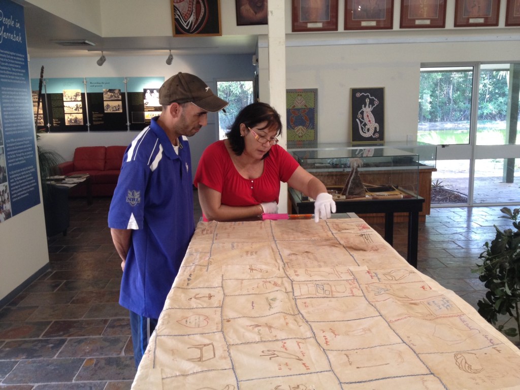 Trish Barnard (Queensland Museum) and Bradley Higgins (Menmuny Museum) examine the embroidered cloth.