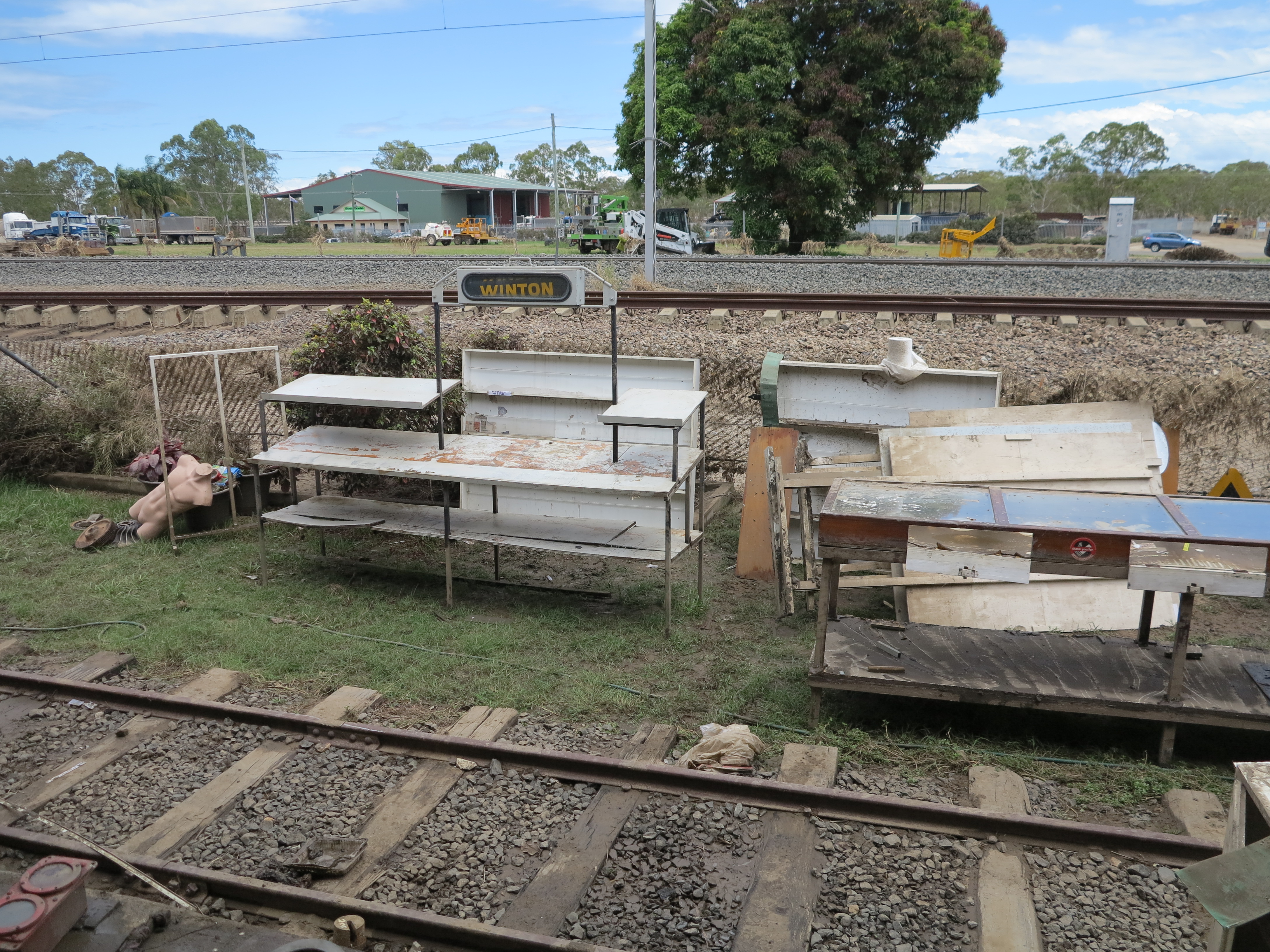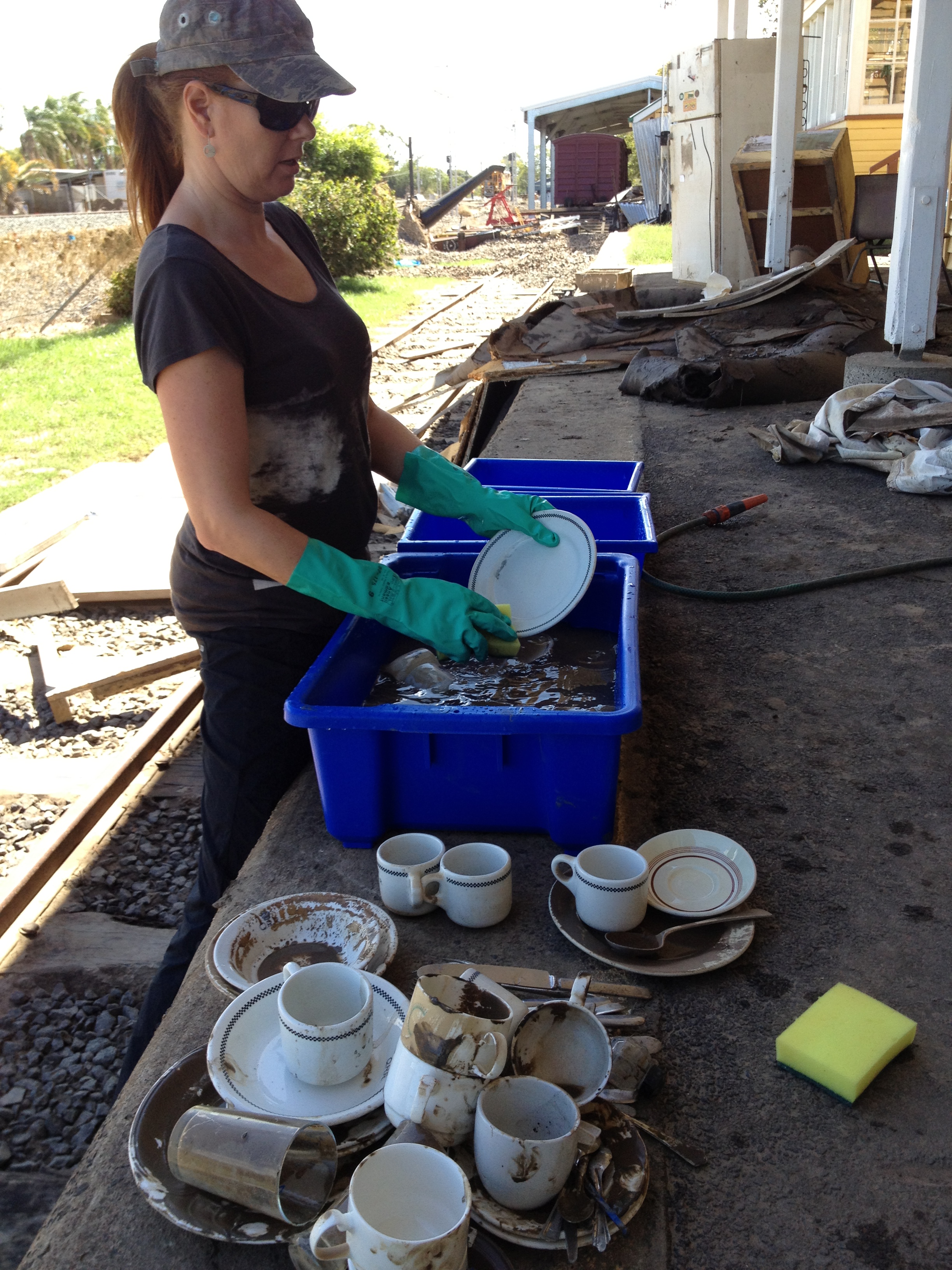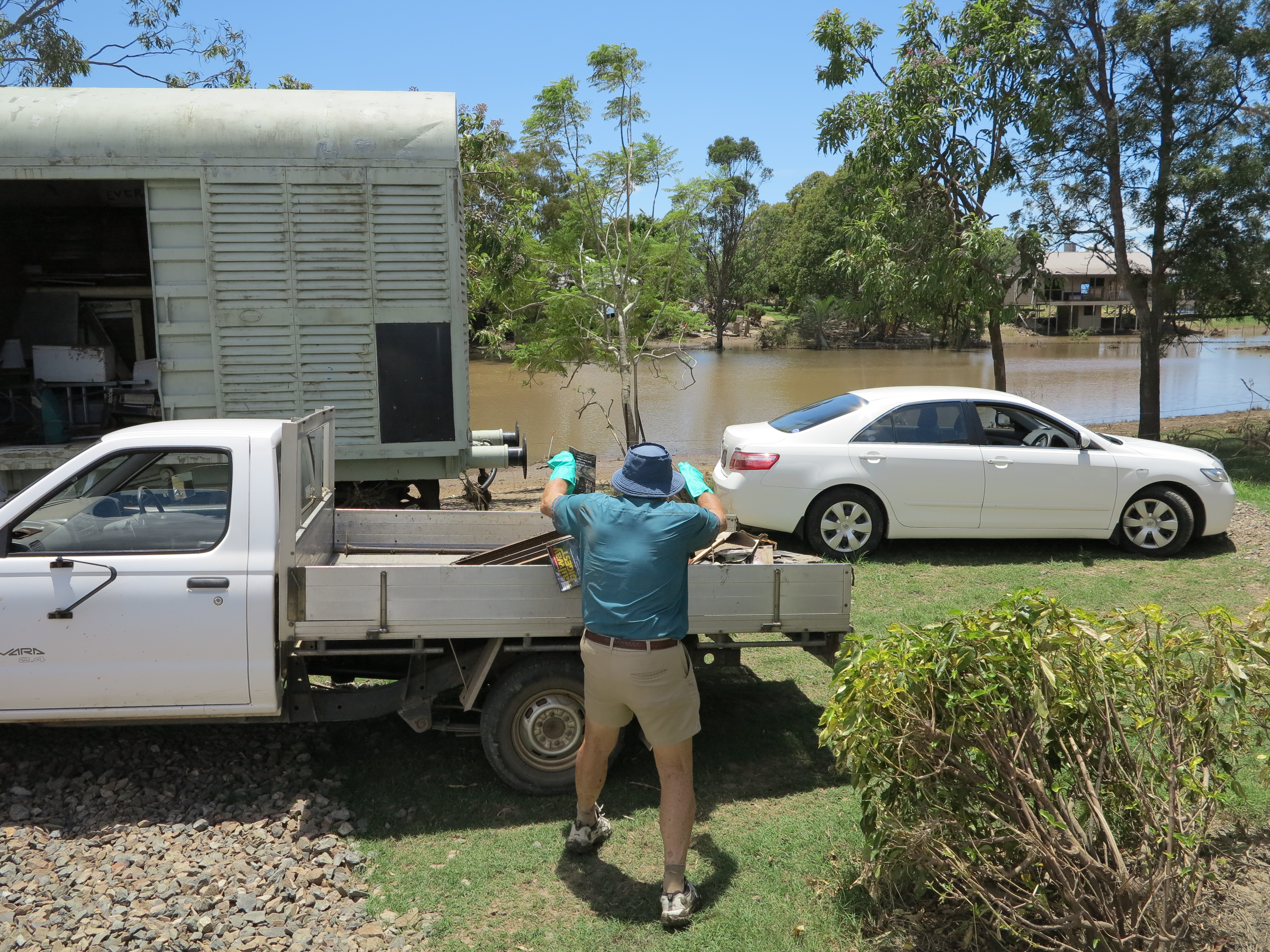 “By Saturday evening we had cleaned out and mostly mud free couple of rooms. There are some corners that got missed in the combined help from my family members, especially my son for taking control of the volunteer gang to strip everything off the walls and all out of the rooms – in preperation for the two volunteer water gernie trucks from Gladstone and Boyne that came to pressure clean the floors and walls. The team from P.C.Y.C. “Blazers ” group young and old who only had about three hours to stay but put their effort into the job. Then the council officer arrived also with a group from their mud army to assist. My son and his brother-in-law returned on Sunday with a motor gernie and finished cleaning items on the platform and stacked these against the buildings. The council pickup truck came in to clear a load of rubbish and we are on the list for a bobcat to shift the gravel. The volunteer electricians from Brisbane have visited and checked the building and we are now waiting on ERGON to replace the meter box before continuing. I have been sifting through saved dry items and some not so dry and have had pleasant surprises in finding things safe. In all I have four freezers storing wrapped items and after my plea on ABC radio we finished with three more than required, also one chap prepared to go out and buy one for us.”