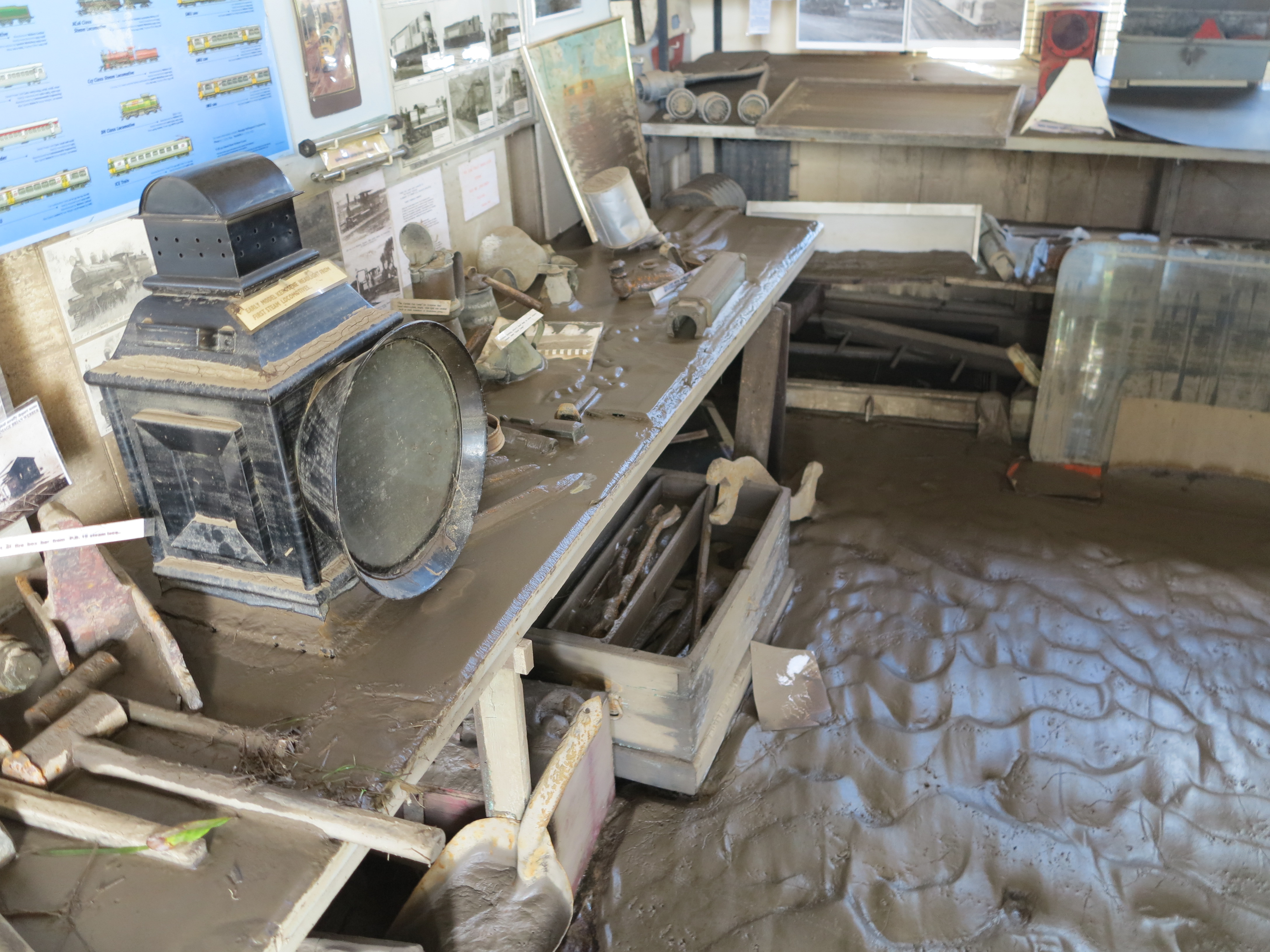 The water and mud entered into all of the exhibition spaces – the railway station building, signal room, railway carriages and other outdoor areas. These photgraphs show the height of the water and the number of museum objects that went underwater.