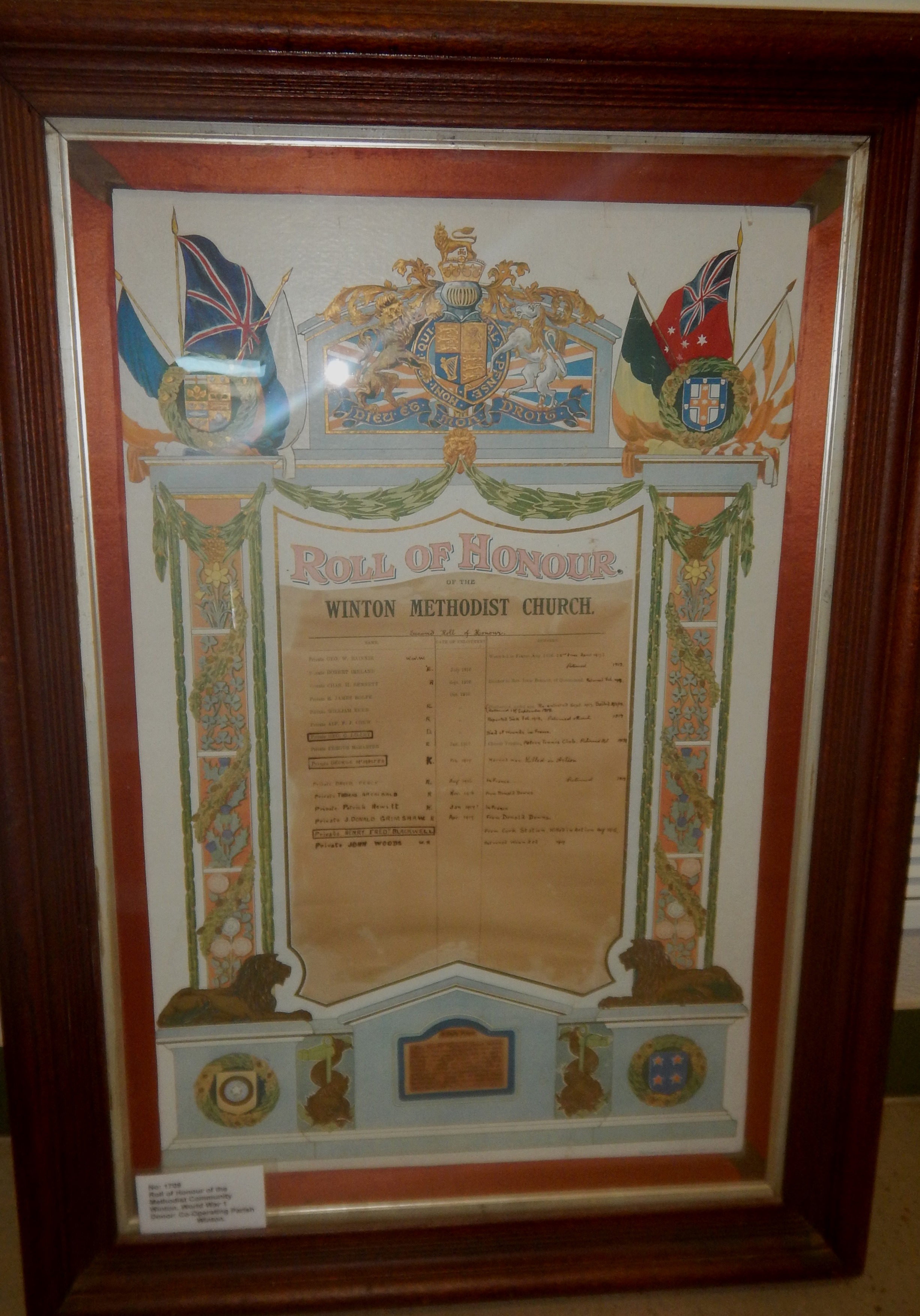 Other objects strongly represented in collections include honour rolls and memorial boards. Irvinebank, Croydon and Winton have decorative items that commemorate citizen’s involvement and sacrifice. During their travels out west, Jo and Ewen met up with Central Queensland MDO, Dr Melanie Piddocke, in Winton and found a number of interesting items at the Qantilda Museum at the Waltzing Matilda Centre.