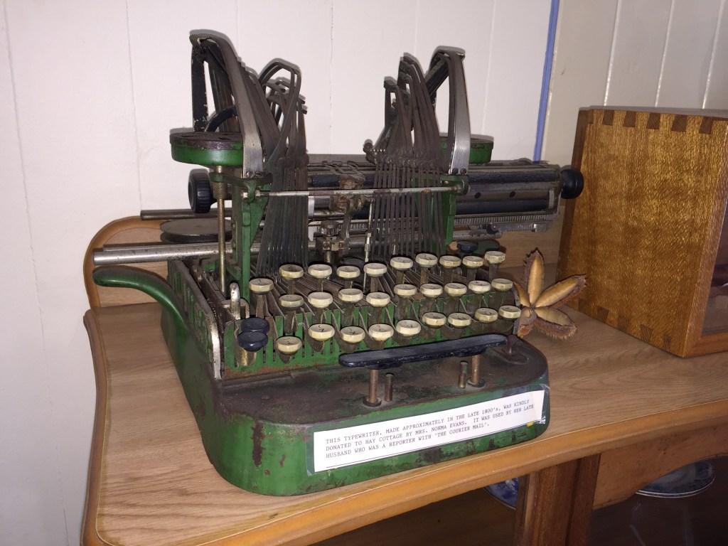 But it isn’t just the unusual “down strike” format, the age, or the fact that it wasn’t black with pretty writing that I find this particular typewriter interesting and valuable. It was because it was used by David Edgar Evans, a local resident and newspaper correspondent, during the 1930s’. I’m told that Evans would type up his regional reports on this machine before forwarding it through to the Courier Mail for publishing. Unlike a multitude of unprovenanced typewriters sitting on shelves in our museums, its importance doesn’t necessarily lie in it’s ranking in the evolution of the printed word. The significance of this particular item lies in the way that it illustrates how the Dayboro community stayed connected with the rest of Queensland, and the importance of the region in Queensland daily life. It speaks of the means and importance of communication within our state. Through the documents it helped produce,  many years on we know about the issues and events of the time that Queenslanders of the time valued and found important.