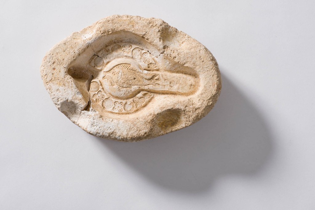 Mould made lamps were formed in a mould. Moulds facilitated the speed and efficiency of lamp production. Moulds were usually formed out of clay or plaster, or carved from stone. They were made in two parts: a top and bottom. The top part of the mould carried the inversed design intended for the discus or other parts of the upper lamp, the bottom part devoid of decoration and largely functional. Sheets of damp clay were pressed into both halves, and once dry, the mould was removed, and the two halves were joined together, and holes pierced into the clay, and a handle could be added, and a thin slip, or clay wash, was applied and the lamp was then fired in a kiln. The use of a mould also allowed for inscriptions such as makers marks to be easily added to the lamp base at the time of manufacture.