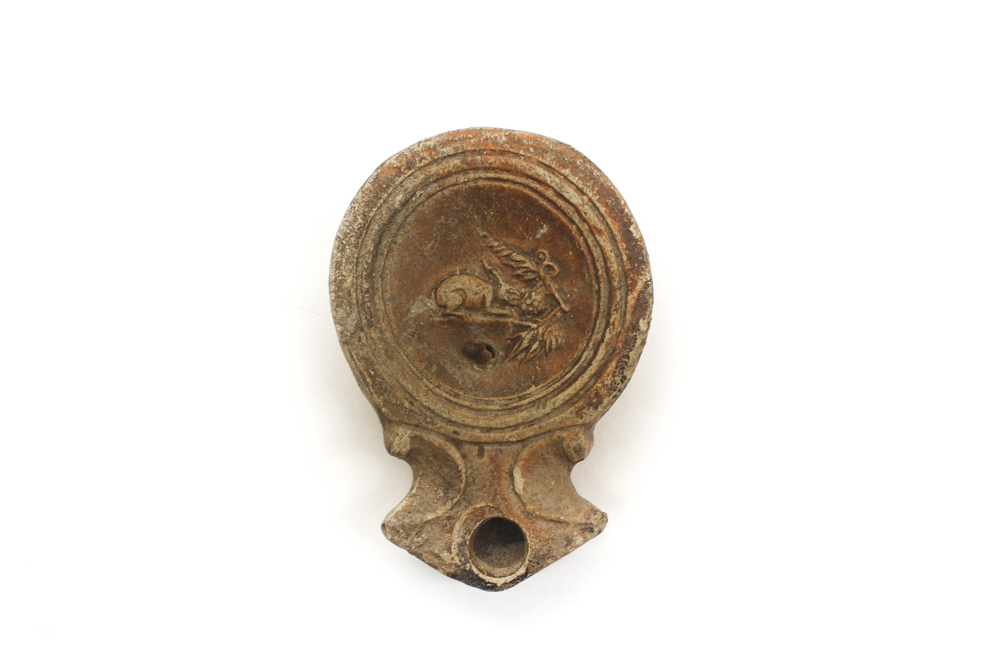 By their very nature, saucer lamps and wheel made lamps were generally devoid of decoration, but with the advent of mould made lamps the artistic nature of the maker could be expressed, and lamps become embellished with designs. The discus, or upper concave surface of the lamp, could be adorned with simple geometric patterns or incorporated elements of mythology as in the lamp seen in plate 2. The discus on this lamp has been adorned with a rabbit or hare eating berries or grapes. Both the hare and rabbit are features of Greco Roman mythology, symbolising romantic love, as well as, abundancy and fertility. This lamp also has burn marks at the nozzle indicating use.