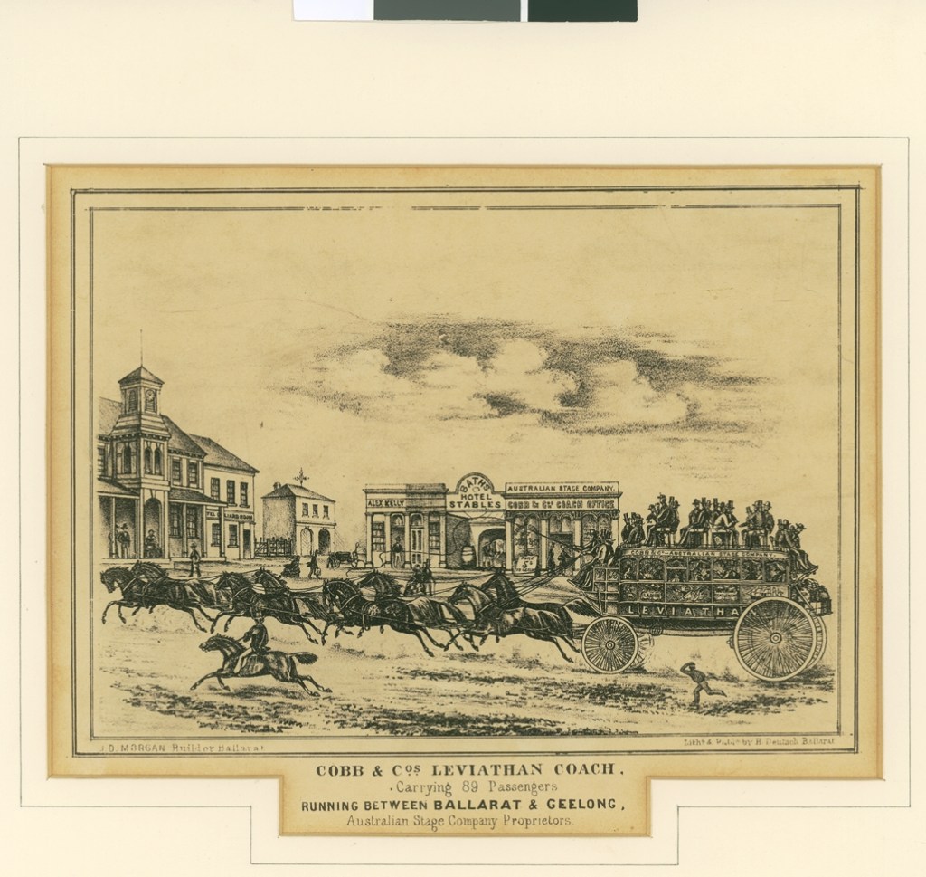 Cobb & Co’s ”Leviathan” will start for Geelong on Saturday morning at 11 O’clock a.m. The above was built by J.D. Morgan, of the Township.
