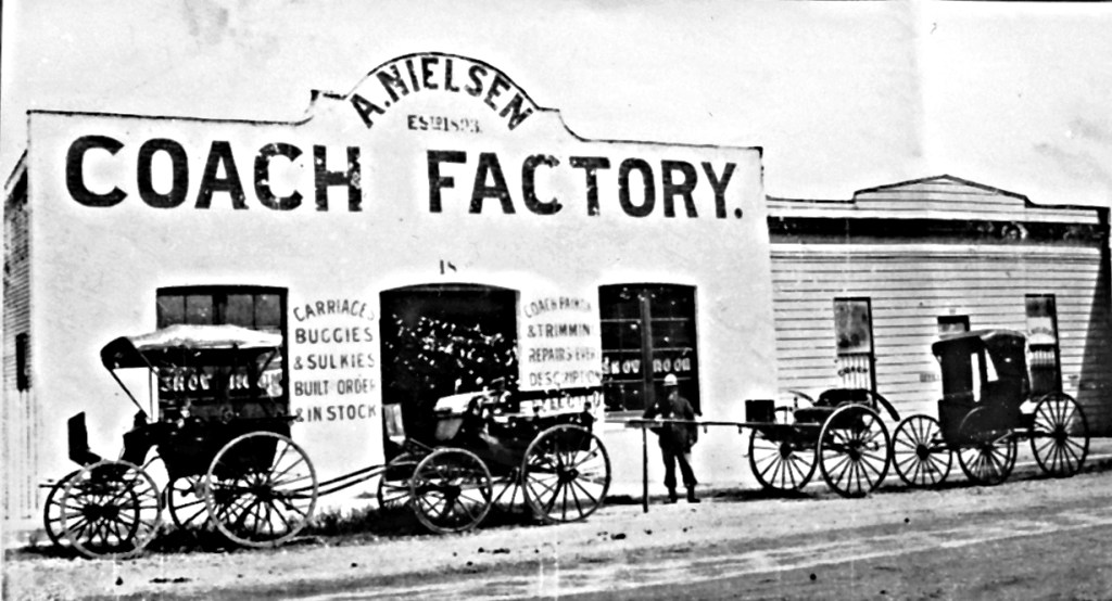 As colonial Australia spread wheelwrights and blacksmiths were among the first tradespeople in any new settlement. Most started off building carts and wagons, but produced passenger carriages as the human and horse population grew. There were hundreds of wheelwright and coachbuilding shops across Australia. Lachlan McLean’s workshop in Queen Street Brisbane built farm implements and ‘drays on the shortest notice’ for Queensland’s earliest free settlers in 1842. (Moreton Bay Courier 15 April 1848: page 1). (Moreton Bay Courier 15 April 1848: page 1)