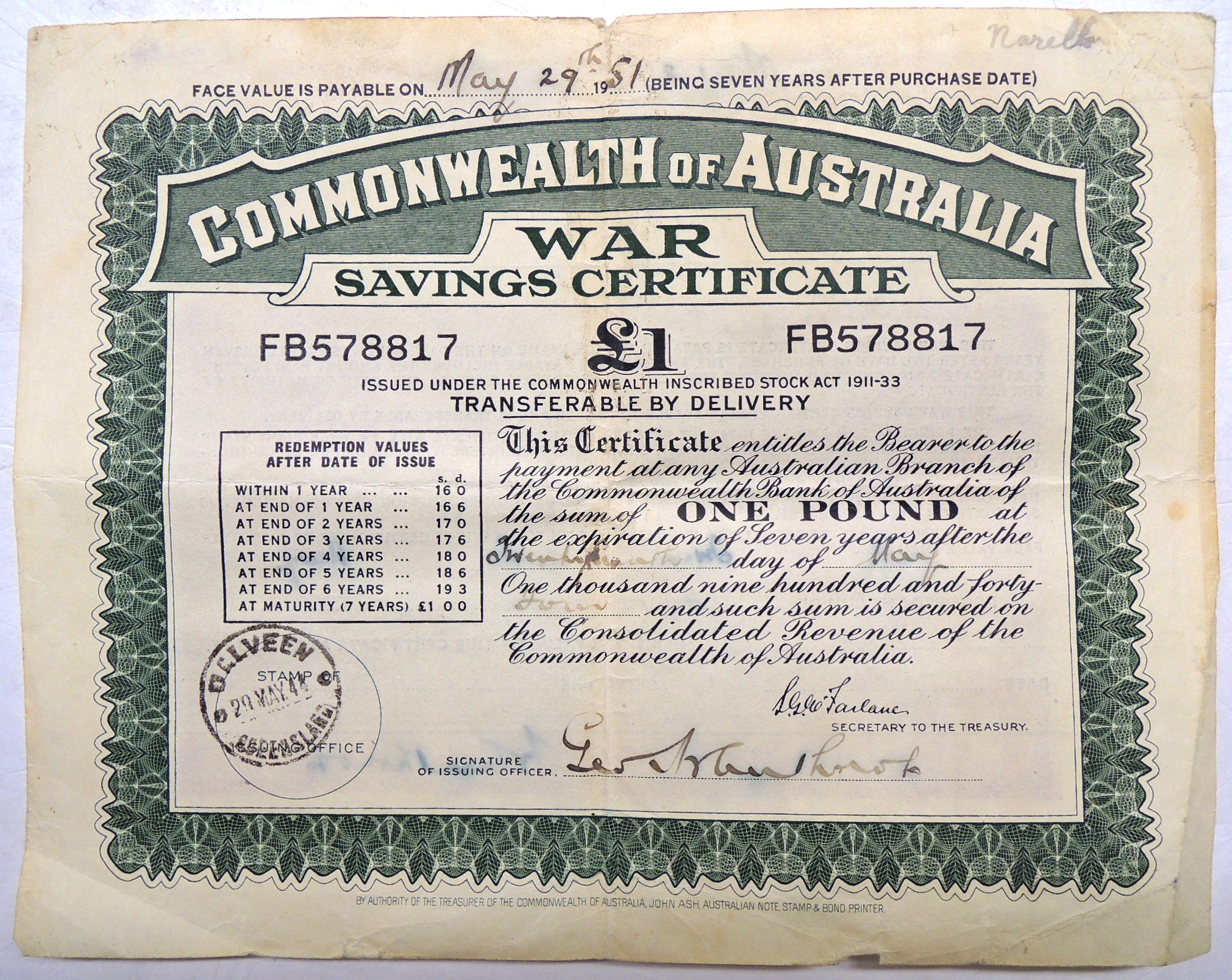 Ironically, despite Noel Hill’s hard work and good intentions for his daughter’s future, the three War Savings certificates were never redeemed. Narelle found the certificates in an envelope in a drawer about a year ago. Now classified by the Australian Office of Financial Management (AOFM) as ‘Overdue Securities’, it is still possible for the certificates to be redeemed for their allotted face value if they are presented in person to the AOFM office in Sydney. They have not accrued any further interest since their original redemption date and the cost of travelling to Sydney is obviously not a financially viable option for Narelle.