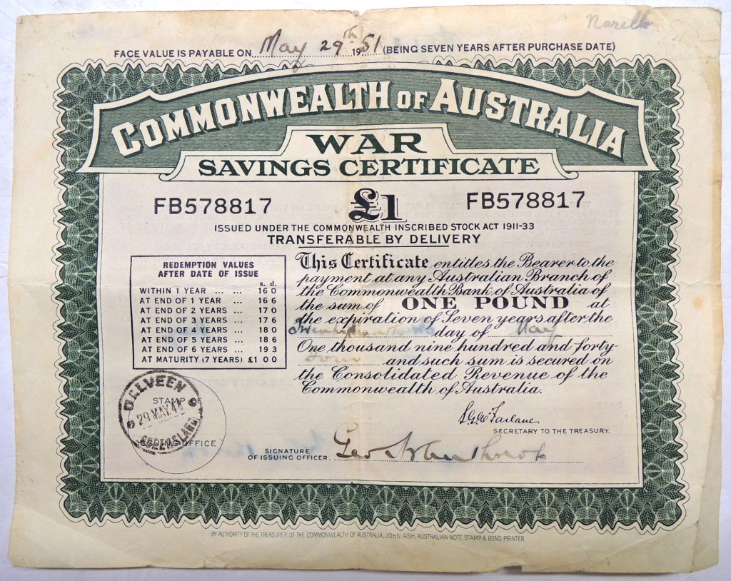 From 18 March 1940, Commonwealth War Savings Certificates (similar to those printed from 1914-1918) were available from over six thousand banks and post offices throughout the country for purchase by the public. The certificates were sold with face values of one, five and ten pounds with the purchase prices (16/-, £4 and £8) being four-fifths of the face value and set to mature seven years from the date of purchase. When people purchased these certificates this effectively meant that they loaned the government money to go to war.