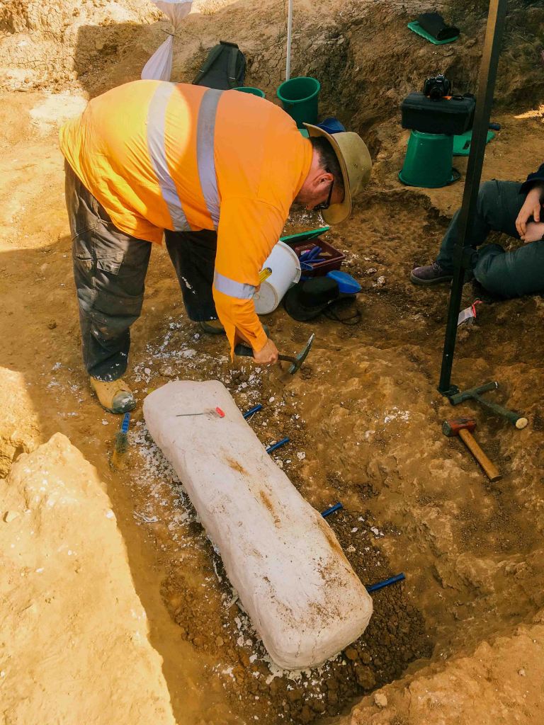 To begin the process of extraction, we first cover the bone and pedestal with foil to act as a protective layer. It is then covered with strips of wet newspaper, which provides cushioning for the jacket we are going to make to contain the bone. To make the jacket we use strips of hessian dipped in a plaster mix (casting plaster and water) and wrap them around the pedestal with the bone and wait for it dry. This is always the fun job!
