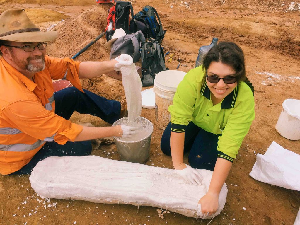 Top Image – The dig team sit proudly around the tibia of the world’s largest species of kangaroo, all ready to be extracted. Image Credit: Rochelle Lawrence.