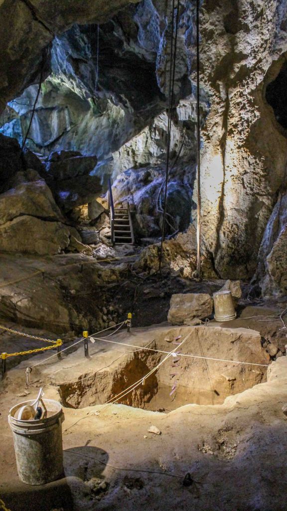 As we head north into the subtropics of central eastern Queensland we find fossils of megafauna from The Caves region near Rockhampton. The fossil remains of these animals that lived around and inside the cave systems have accumulated in cave chamber deposits. These deposits are unique as they record fossil fauna from different environments that transitioned through time from wet rainforests to dry open-arid habitats and then to today’s special vine thicket refugia (habitat supporting refuge). Here we find fossils of the extinct giant tree-kangaroo, Bohra, who is a larger version of today’s living tree-kangaroo species found in Far North Queensland and New Guinea.