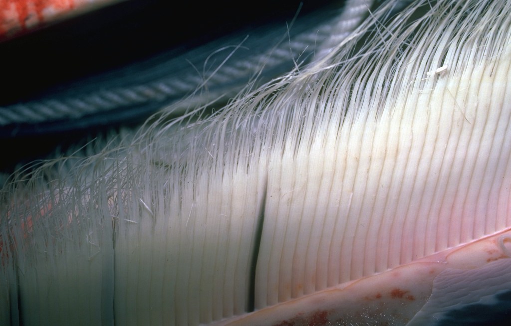 The baleen is made of keratin and acts like a filter to trap the plankton. The whale takes a mouthful of water, then pushes the water back out through the baleen that hangs from the upper jaw, and the plankton (ie. krill and other small marine animals) remains in the mouth.