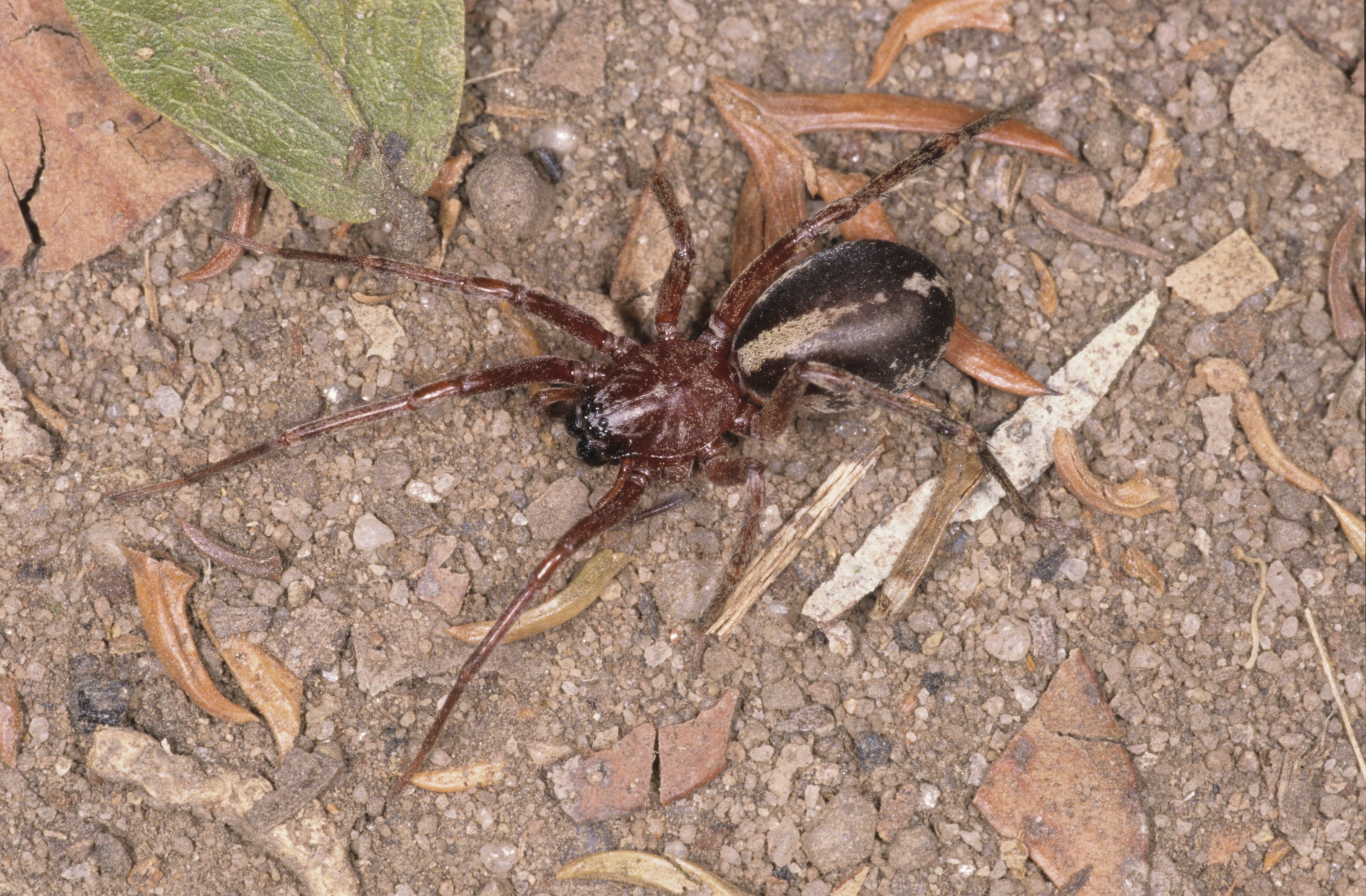 Blending into the earthy landscape, the eight legged wanderer has been described as predominately brown with a distinctive white stripe pattern on the abdomen, with white legs.