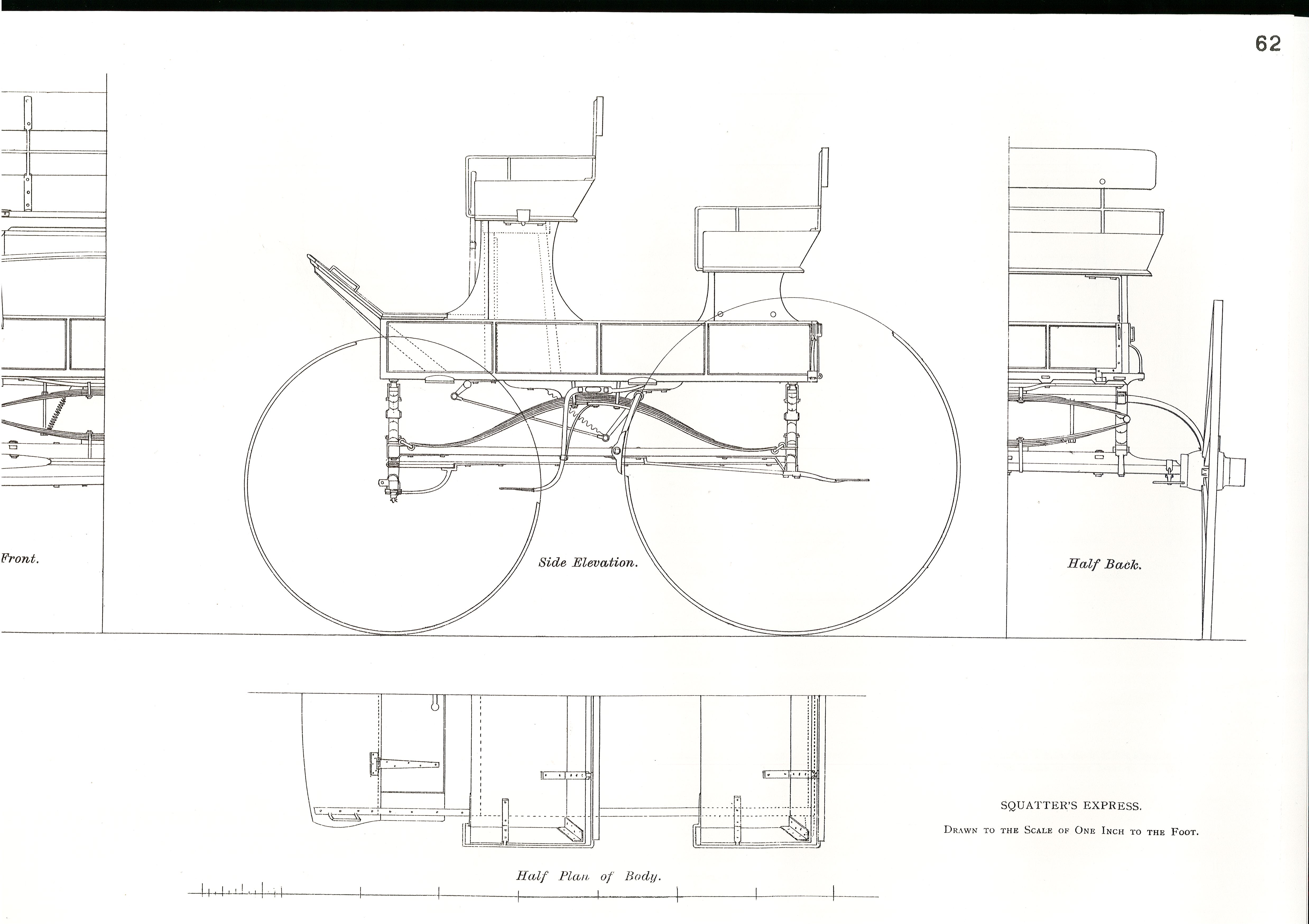A visit by volunteer Bob Edwards cast a bit of doubt the name of our vehicle. Bob came in to see what progress had been made on the ‘express’ wagon. Two side springs and elliptical springs at front and back makes this an ‘express’, sometimes referred to as a squatter’s express or a station express. Bob Edwards has been an Australian four-in-hand driving champion, represented Australia in international carriage driving, a Churchill Fellow, he stewards at the Royal Easter Show every year, has been a harness maker-saddler for five decades and advisor to Queensland Museum for thirty years. What would he know? Well a lot as it turns out. The plans below indicate our vehicle definitely has the express style undercarriage, so it may be called an ‘express’.