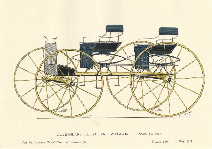 This vehicle without spring suspension appeared in the Australasian Coachbuilder and saddler in the Coachbuilder journal in August 1898 as a ‘buckboard waggon’, but in their compilation Coachbuilder Book of Designs in 1901 it had become a ‘Queensland buckboard’. And why not? It seems springs or no springs it could be a buckboard, and even a ‘Queensland buckboard’.