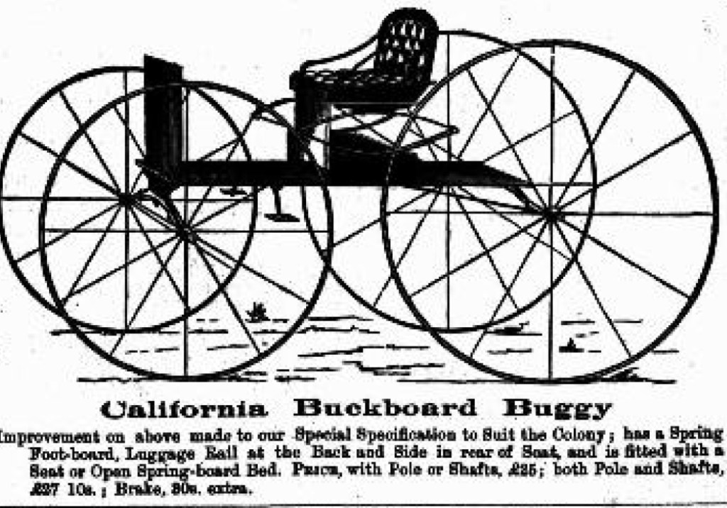 The American buckboard was about as simple a four wheeled vehicle as it was possible to build. They looked like someone had taken a section of picket fence, attached a wheel in each corner and placed a seat on top and halfway back. Comfort was not a major selling point for buckboards, but they were cheap, durable and easy to build. Flex in the slatted floor timbers provided springing, although sometimes the seat was mounted on springs. Buckboards were common in the American west from the middle of the nineteenth century but were not known in Australia until the 1870s. The Australian Town & Country Journal (12 April 1873, p13) carried an article titled ‘A cheap buggy for the bush’ espousing the virtues of ‘”buck board” of the American back woods’.