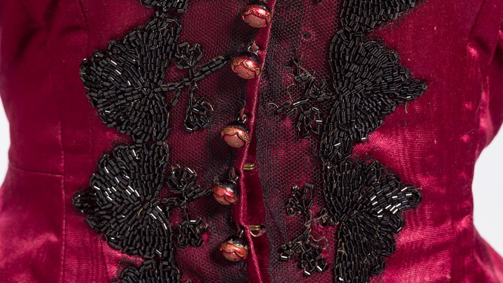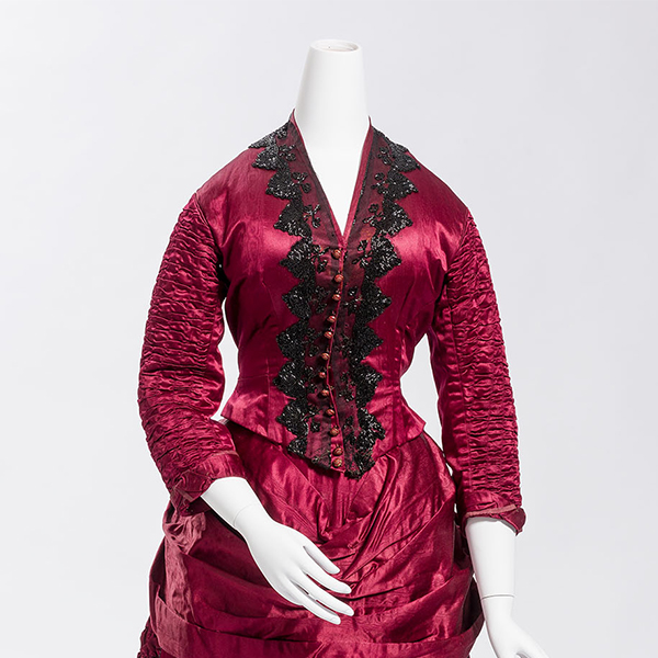 While also managing a farm, Mary Ann and John raised a large family of 12 children: Swinton, Agnes, John Dudley, Arthur, George Lyon, Edward David, Martha, Maud, Amy Dore, James Fred, Randal Hopley and Robert Allan. In 1883, the couple celebrated their twentieth wedding anniversary and Mary Ann made a moire silk satin dress (pictured) in maroon to wear on this very special occasion. She was a skilled dressmaker and created the dress partly by hand and partly using a sewing machine. The fashionable features of the dress indicate Mary Ann was certainly a follower of fashion. Her dress features