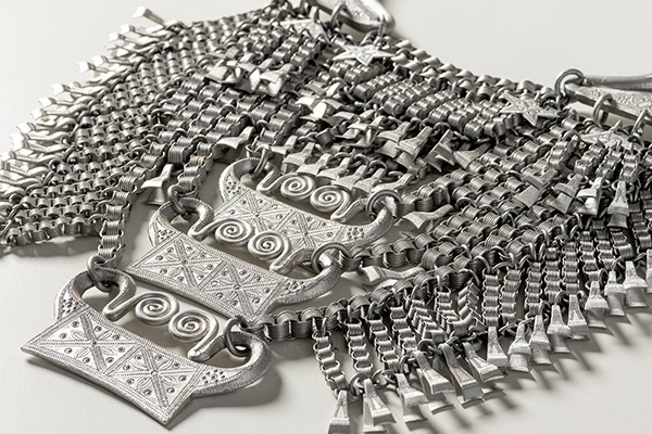 In Hmong tradition, silver jewellery symbolised wealth and prosperity and was used both as wealth accumulation and for gift exchange. Because silver was not available in refugee camps, people began to use aluminium food tins and melted down pots and pans which were in plentiful supply. This aluminium necklace was made in Ban Vinai refugee camp. Come and see these necklaces and their remarkable detail up close in the exhibition.