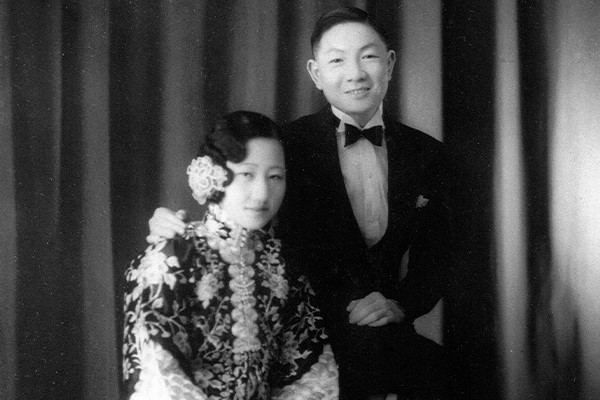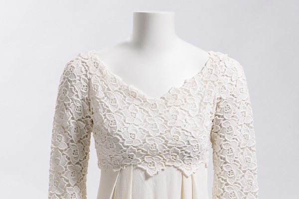 Worn by Nellie Sun Jue Yow in 1934, the ceremonial dress, which translates to ‘long skirt and top coat’ in English, reflects Nellie’s Chinese heritage and a traditional belief that a bride who wears a qun gua expresses luck, prosperity, abundance and future happiness. According to traditional Chinese custom, a qun gua must only be worn once in a lifetime by a bride on her wedding day. You will find Nellie’s ensemble on display with its striking embroidered peonies and silver metal thread.