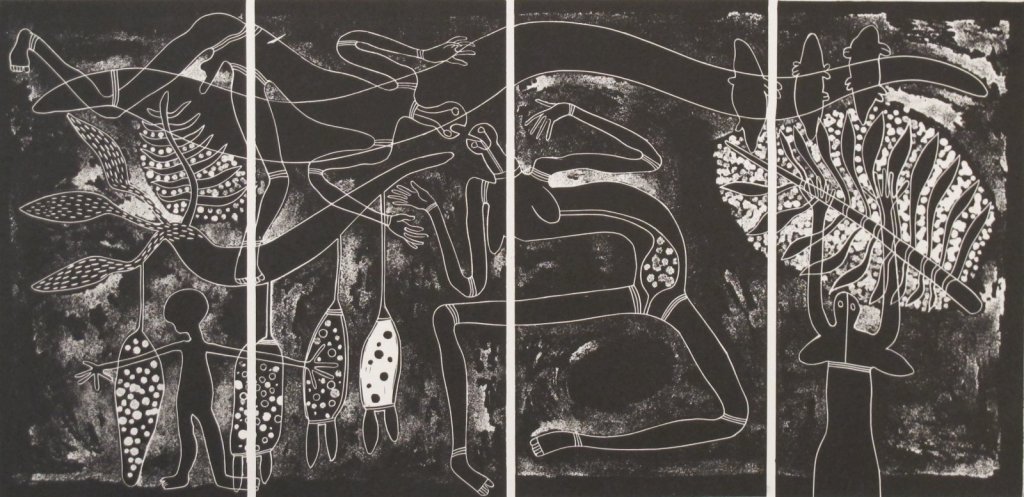 The linocut print, ‘Laura Dreaming’, which Queensland Museum is proud to have in its collections, is also held in the National Gallery of Australia and is one of a series of prints made in 1989 for exhibitions in Sydney and Paris. Combining Western art practice with Indigenous aesthetics, the work was inspired by Arone’s visit, in 1990, to ancestral rock-art sites at Laura, North Queensland.