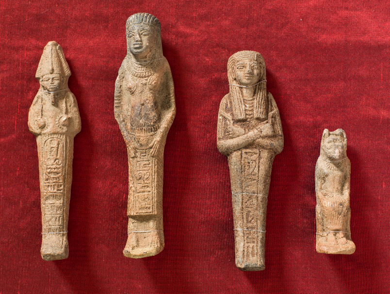 Of all the items collected, coins are the most common artefact type, followed by amulets, shabtis (figurines placed to answer their deceased master’s call to work in the afterlife) and figurines. There are also examples of domestic equipment (a glass bottle, a bottle strainer, bowls and lamps), architectural and building materials (nails, tiles, cement, mosaic tesserae, and pieces from Egyptian monuments), jewellery (a necklace and a pendant), and stone tools.