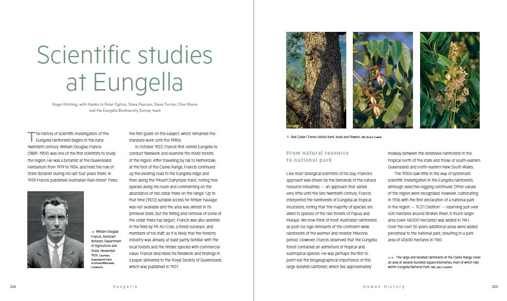 William Douglas Francis (1889–1959), who later became State Botanist at the Queensland Herbarium in the early 1950s, was one of the first scientists to visit Eungella. (A specimen of Corduroy Laurel (Cryptocarya corrugata) that he collected in October 1922 is held in the collection of the Royal Botanic Gardens Victoria.)