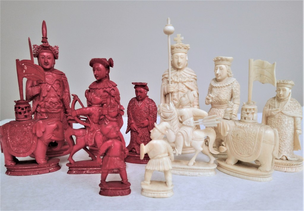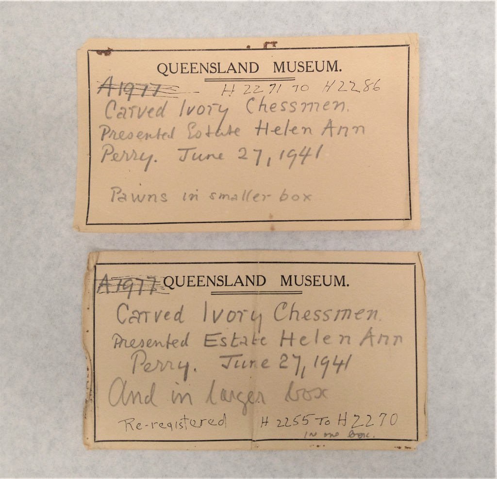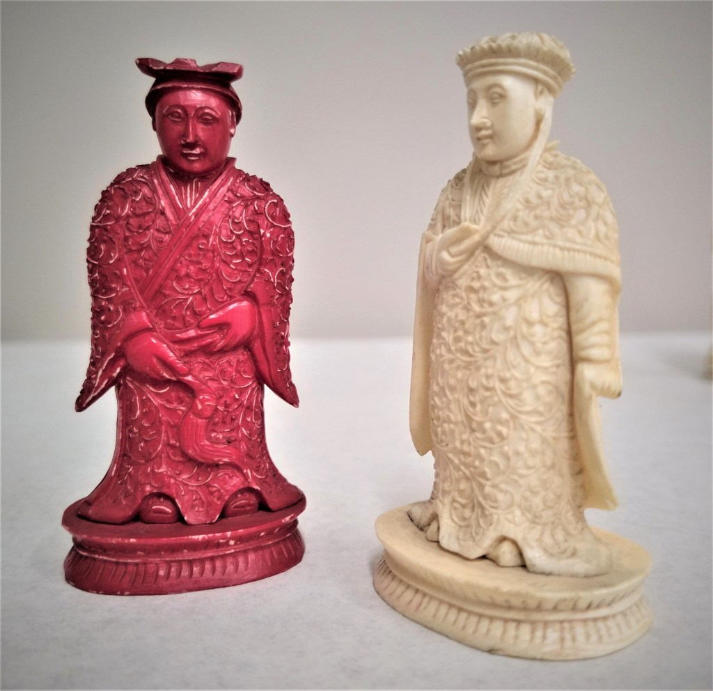 Gifted to Queensland Museum in 1941 through the estate of Miss Helen Perry of Camden Street, Albion, the finely carved red-stained and natural ivory shows members of the Chinese court mounted on oval-shaped bases, the emperor and empress enthroned, the knights and pawns as mounted soldiers. Each exquisitely crafted piece speaks a body language all its own, from facial expressions and gesture to physical appearance and pose.
