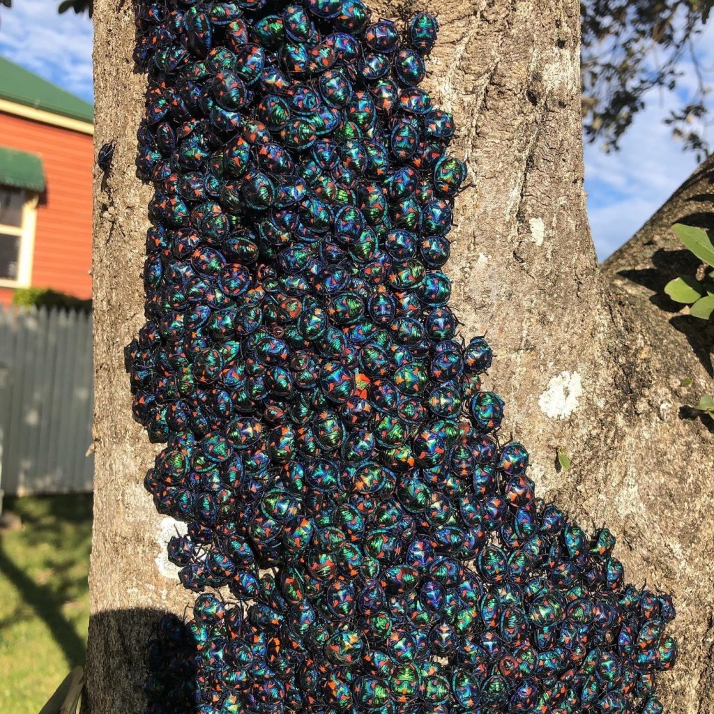 Like many True Bugs, the Hibiscus Harlequin Bug often form large aggregations, especially while nymphs, as a protective ‘safety in numbers’ strategy. Most of the nymphs in this aggregation are later stage instars with short wing buds, mainly bright metallic blue or green with bright red or orange patches. However, hidden within the cluster are a few very early instars, with dark metallic blue head and thorax and bright red abdomen with dark metallic blue central patch and margin – can you spot them?
