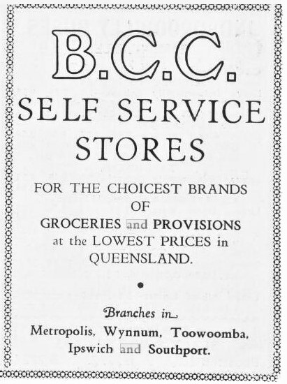 A change in retailing in Queensland came with the Brisbane Cash and Carry (BCC) Stores, established in the 1920s by Mr CA (Claude) Fraser on the ‘help yourself principle’. The customer was given access to rows of shelves to select their goods, and then ‘carry’ the purchases to the ‘check out’ point of the store. No longer was there any waiting for sugar or flour to be weighed, all goods were pre-packaged and ready to go. Payment was in cash only on the spot, hence the name ‘cash and carry’. The BCC Self Service stores as they became known needed fewer sales staff, and consequently could offer cheaper goods at ‘rock bottom prices’. Self-service also resulted in faster shopping for the customer. (1)