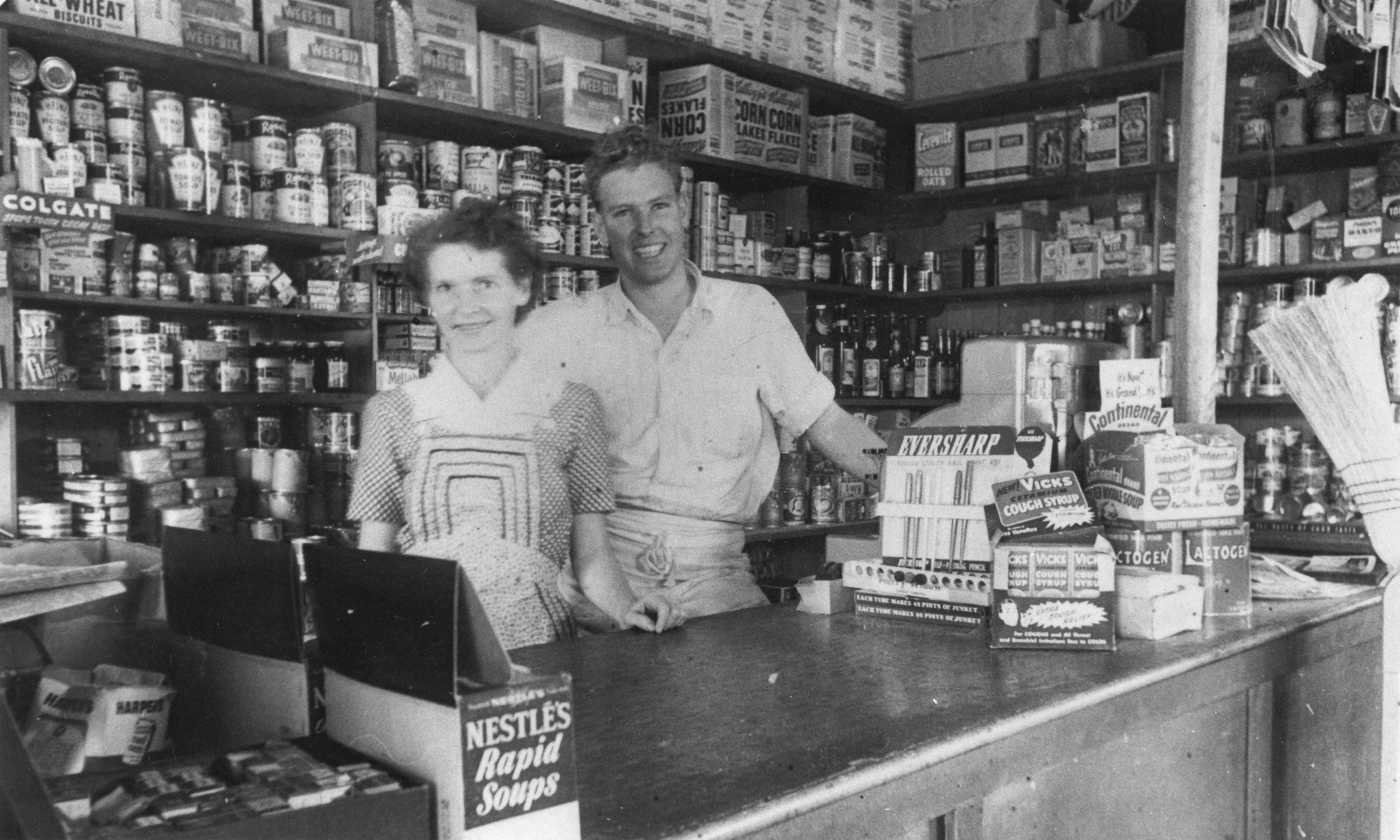 Customers in this era never served themselves. The shopkeeper, staff and the shelves of goods were behind a big wooden counter. The customer, almost always a ‘housewife’, told the shop assistant what goods were required and then waited while the items were collected. Sugar and flour were stored in bulk and had to be weighed and poured into paper bags. It was all a little time consuming. There was often a chair for the customer to sit on while being served. Patiently waiting children may have received a complimentary sweet. (‘lolly’) Money did not necessarily change hands. The price of all the purchases across a week was ‘booked up’ (recorded) for regular customers, and the account ‘settled up’ after payday.