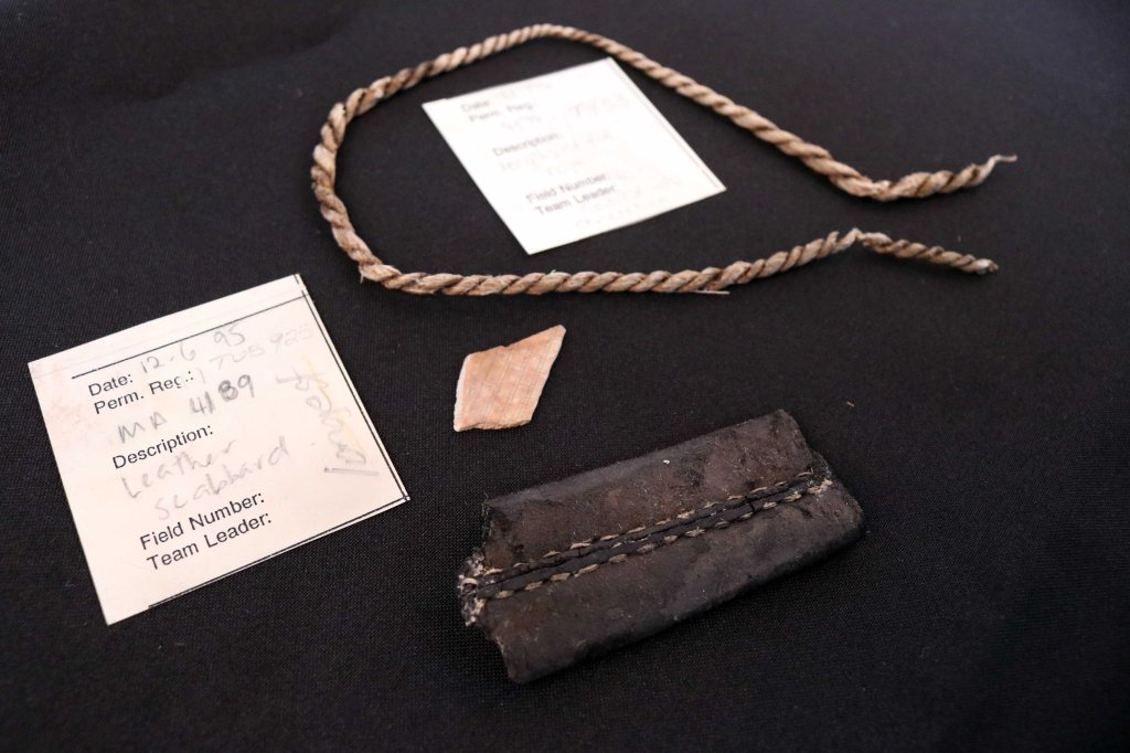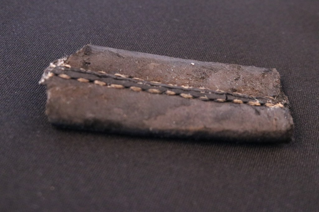 This fragment once belonged to a full leather scabbard for a bladed weapon. A scabbard is a sheath for holding a sword, knife, or other large blade.