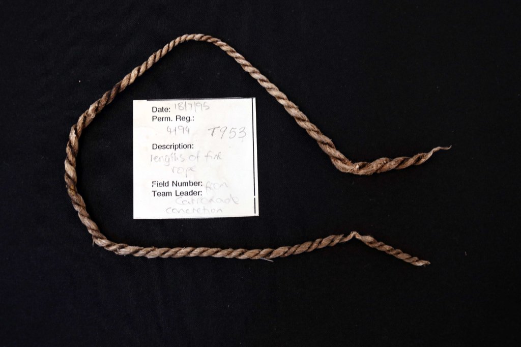 Recovered from concretions around the 18-pounder carronade (a short cast-iron cannon which was used by the Royal Navy) this small piece of string approximately 30 cm long is remarkably preserved.