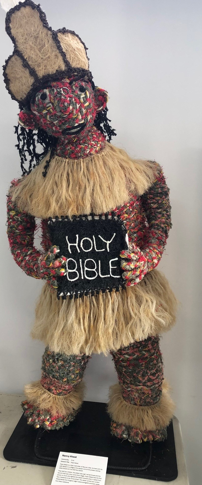 Some objects sweep you off your feet through their good looks, material and textures. Two, in particular, vie for my attention. Popa Dabad, the award winning ghostnet piece by Erub Arts Centre’s Nancy Kiwat, was made in 2016. The colours, materials and inquiring angle of his head always make stop me in my tracks and spend an extra minute in contemplation.