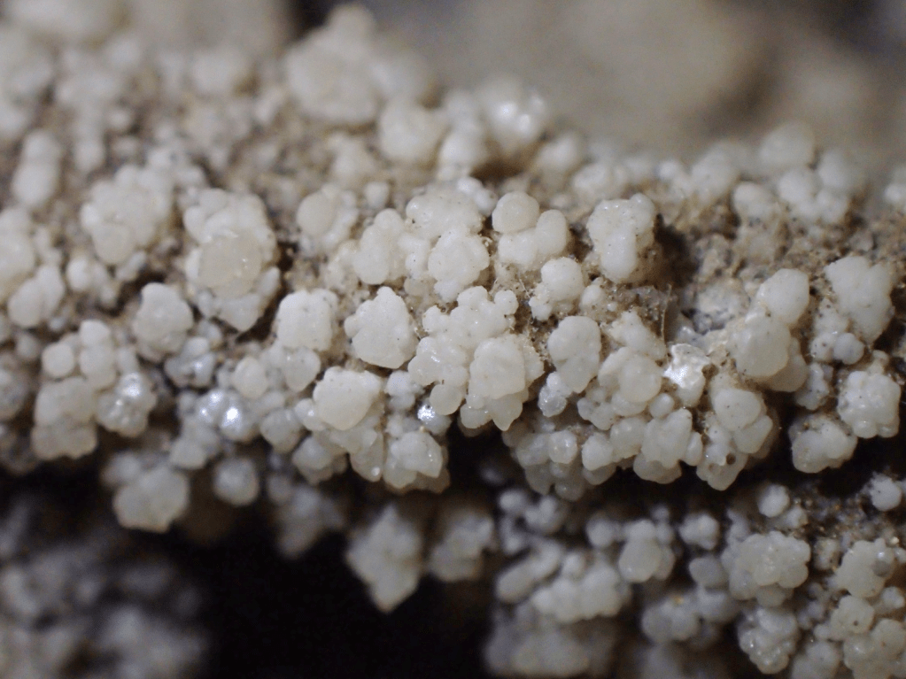 This is the process by which the mantis, found in one of the lower, cooler pools, became encrusted. Other organic material such as twigs are similarly affected. We do not know how much of the original insect remains inside this mineral cast. However the crystalline form, reflecting the shape of the original living insect, opens the question as to whether such a relatively young item can be defined as a fossil.