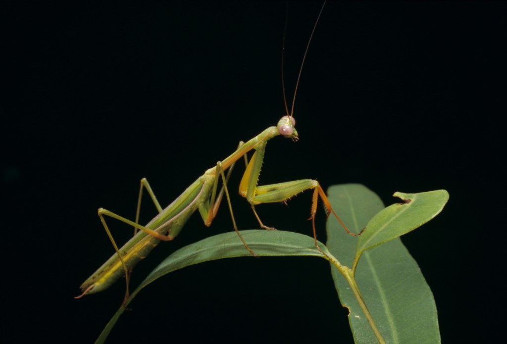 A living False Garden Mantis (Pseudomantis albofimbriata), happily un-encrusted. Photo: Jeff Wright, Queensland Museum.