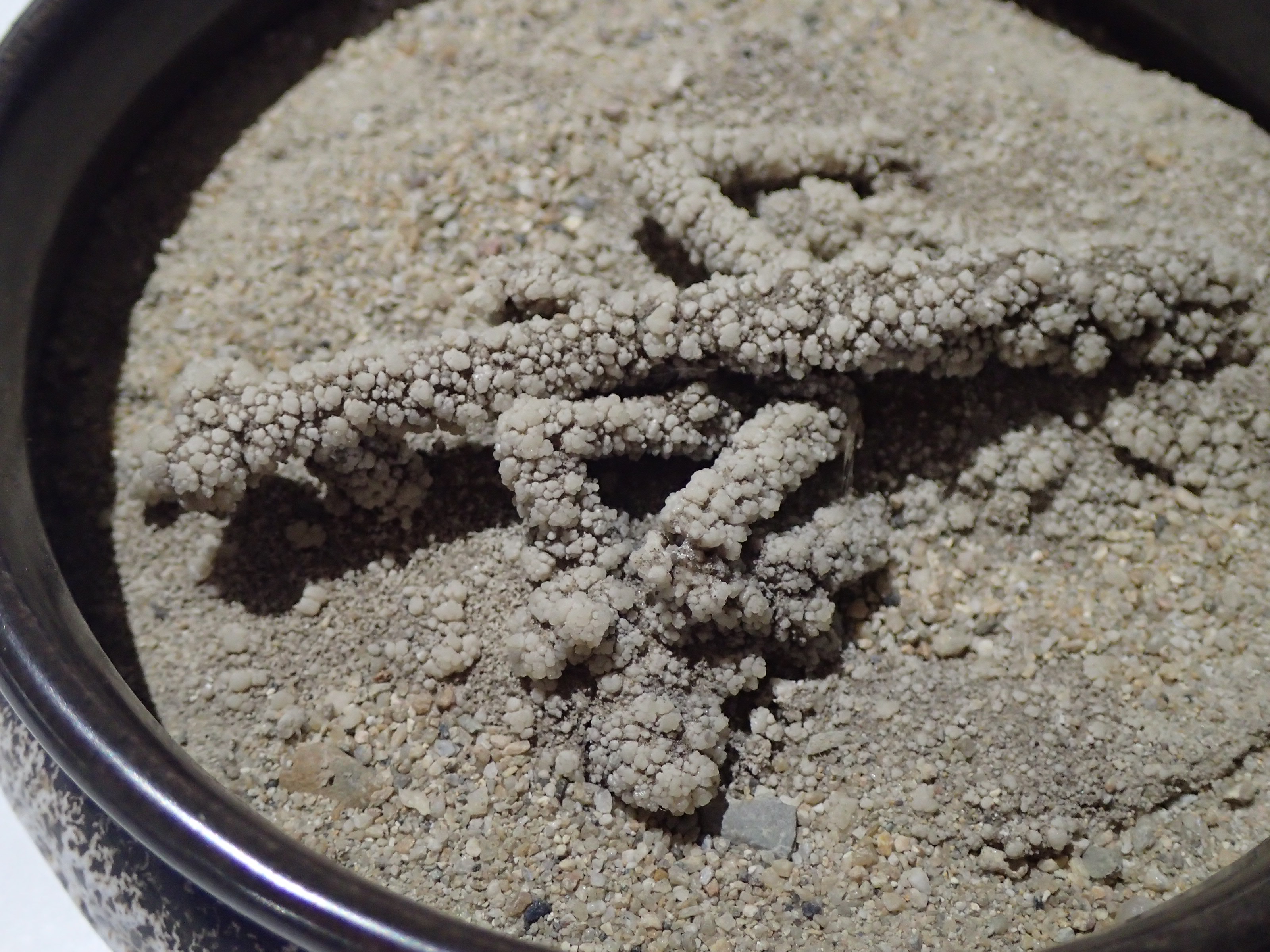 This is the process by which the mantis, found in one of the lower, cooler pools, became encrusted. Other organic material such as twigs are similarly affected. We do not know how much of the original insect remains inside this mineral cast. However the crystalline form, reflecting the shape of the original living insect, opens the question as to whether such a relatively young item can be defined as a fossil.