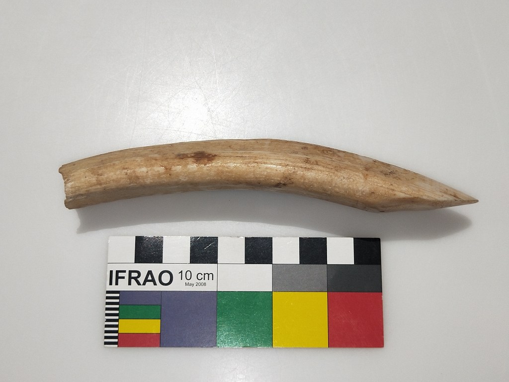 This object came from the Torres Strait. It was gift from a family friend. It is remarkably heavy and shows a polished surface where it has been exposed to use, forming a sharp chisel edge. It is made of a material called ‘dentine’, which indicates that it’s a tooth of some kind, and is hollow at the base. What might it be? A tusk of a hippo or pygmy elephant, perhaps?