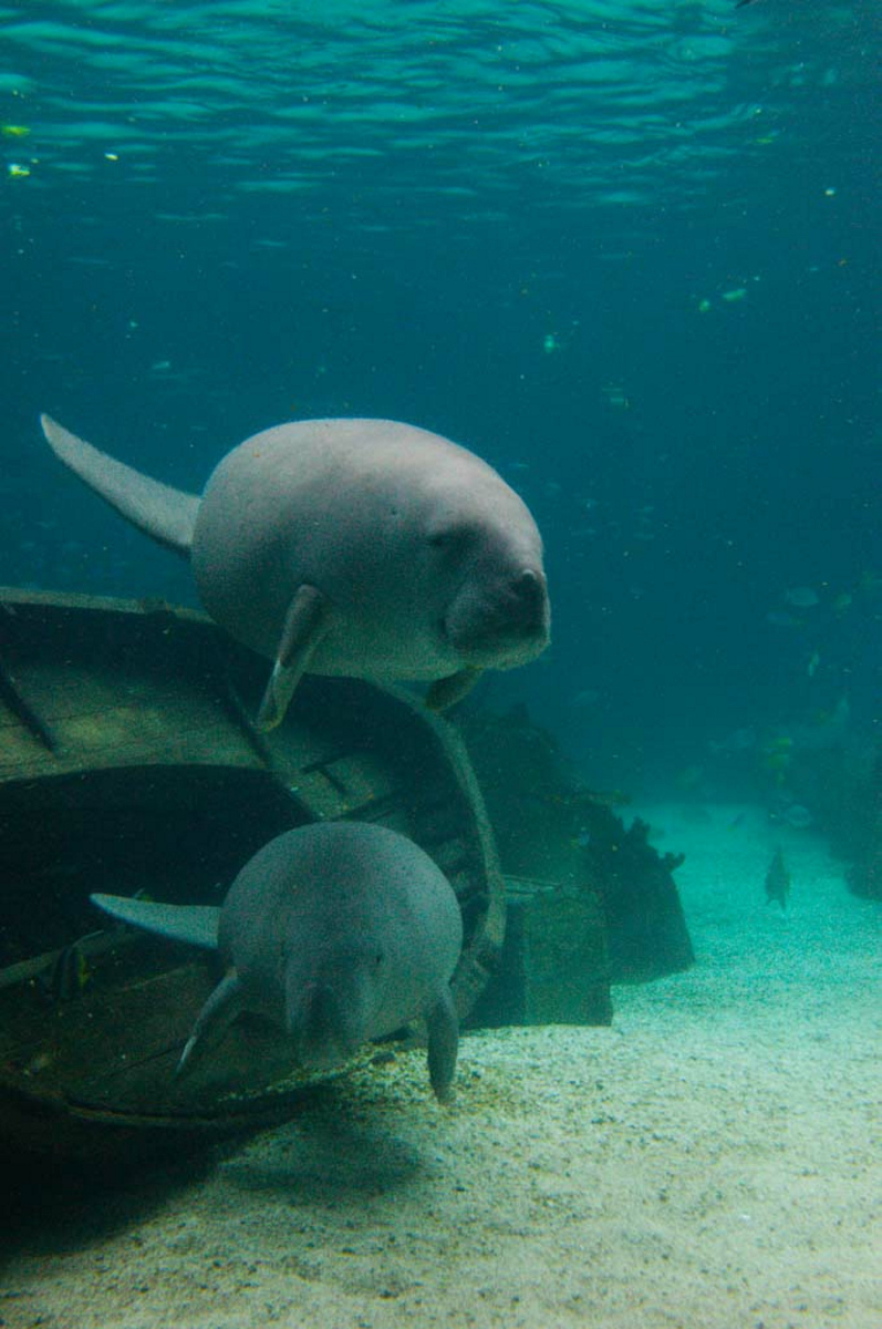 The Dugong is a large herbivorous marine mammal. Along with the manatees (three species) of the Americas and West Africa, the dugong is a living member of the order Sirenia. Dugong are easily distinguished from Manatee by the shape of the tail. Manatee have a paddle-shaped tail whereas Dugong have a tail with two distinct flukes, much like the tail of cetacean mammals (whales and dolphins). Dugong can be distinguished from similarly sized dolphins by the forward position of their paired nostrils. The dolphins have a single blowhole located on the top of the head.