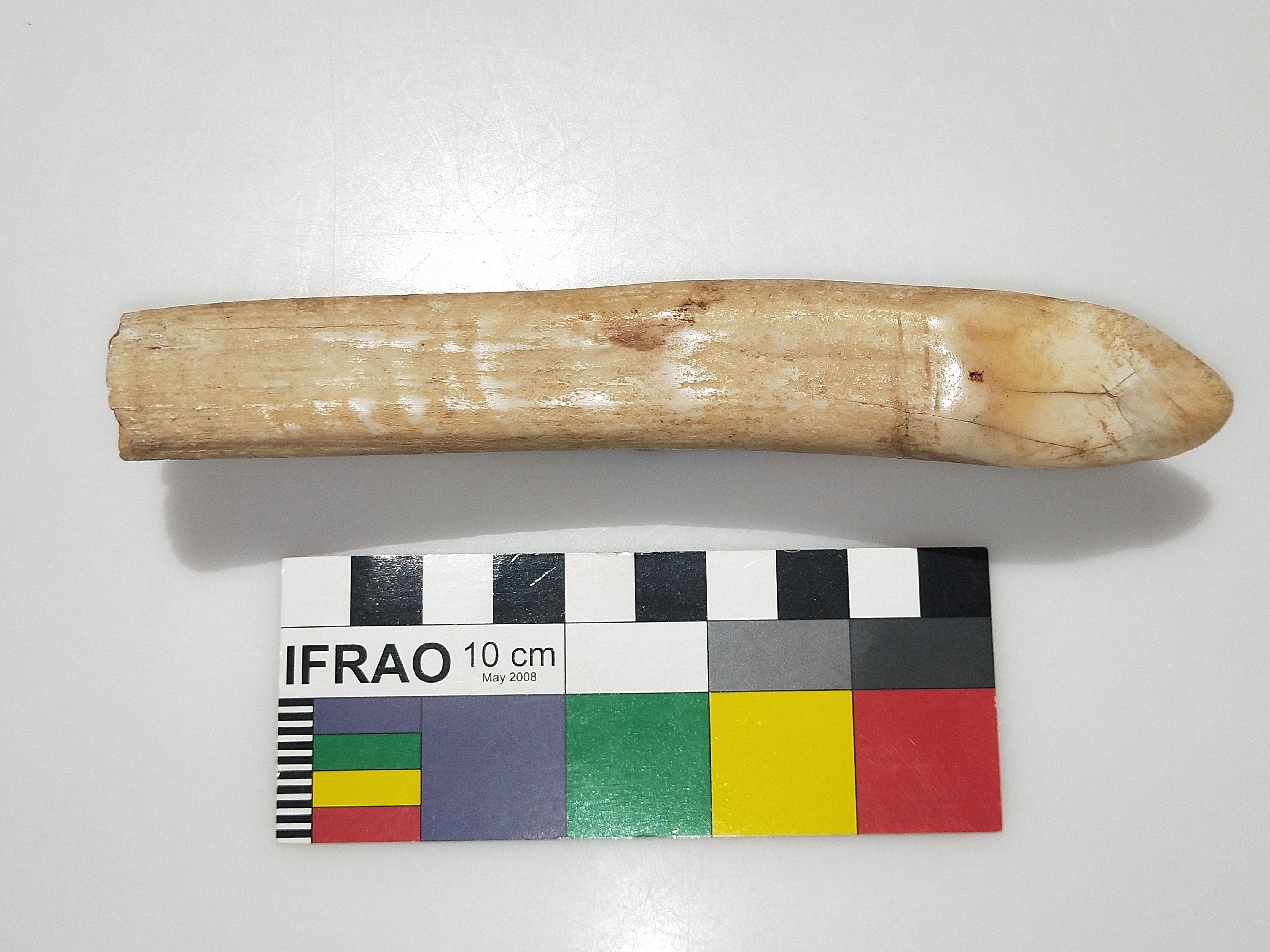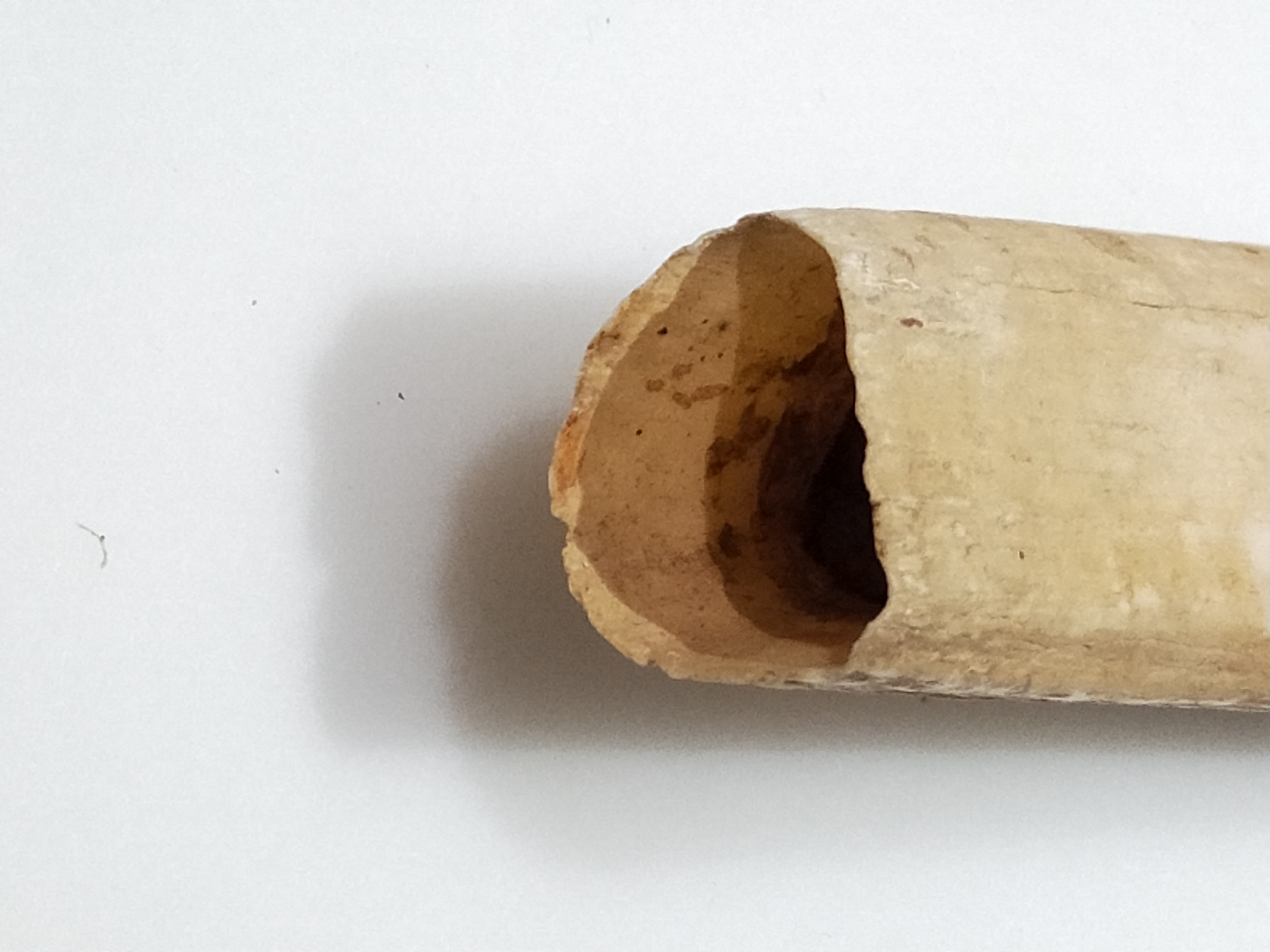 This object came from the Torres Strait. It was gift from a family friend. It is remarkably heavy and shows a polished surface where it has been exposed to use, forming a sharp chisel edge. It is made of a material called ‘dentine’, which indicates that it’s a tooth of some kind, and is hollow at the base. What might it be? A tusk of a hippo or pygmy elephant, perhaps?