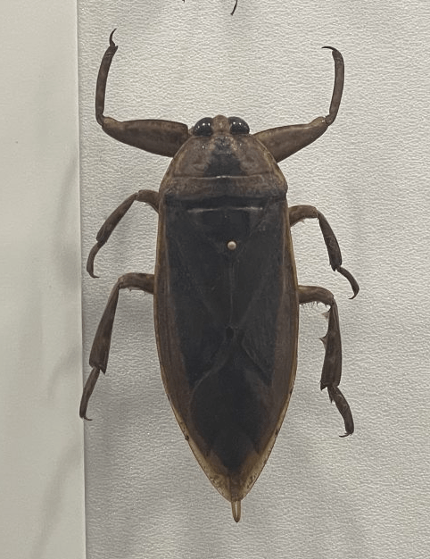 This impressively large insect is a type of hemipteran or ‘true bug’. All hemipterans feed on fluids using a straw-like proboscis. The majority of species feed on plant sap, but some are specialised predators. The Giant Fishkiller Bug (Lethocerus insulanus) is one of these, and as the name suggests, is capable of killing and eating small fishes.