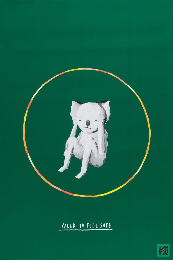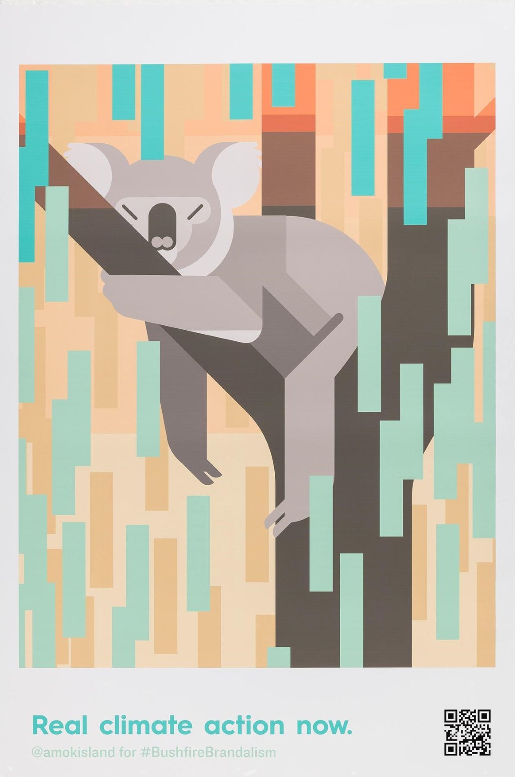 The environmental impact of the 2019–2020 Australian bushfires was immense, with more than 400 million tonnes of carbon dioxide emitted into the atmosphere and an estimated three billion animals killed or displaced nationwide. (3) The destruction of essential habitats was especially felt in Queensland, Australia’s most naturally diverse state. Thirty-nine injured koalas were treated by the South-East Queensland Wildlife Hospital Network, with many more lost. (4) Several Bushfire Brandalism artists such as Amok Island, Blends and David Booth featured koalas, then listed as a vulnerable species in Queensland, in their work. Koalas have since been reclassified as endangered in Queensland and New South Wales, meaning the species is at high risk of extinction in the short term. The impact of drought, disease, urbanisation and habitat loss were compounded by the 2019–2020 Australian bushfires, which many felt were exacerbated by the effects of climate change.