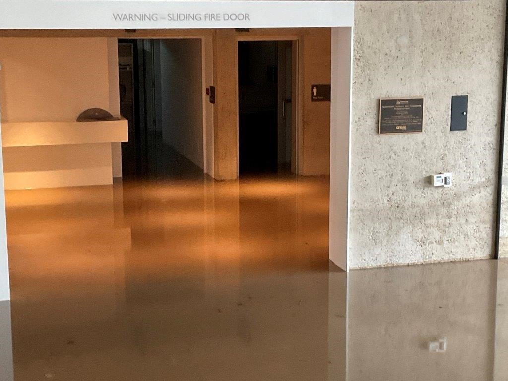 The water flowed fast down the Brisbane River, rising and filling the car parks at Queensland Cultural Centre and rendering the buildings inaccessible. The water crept up, storm waters rushed along Grey Street, the Dinosaur Garden and Level 0 capturing some of the water rushing along past businesses in South Bank and West End. They’d have a great story to tell, our two dinosaurs standing proudly outside, if they could talk.