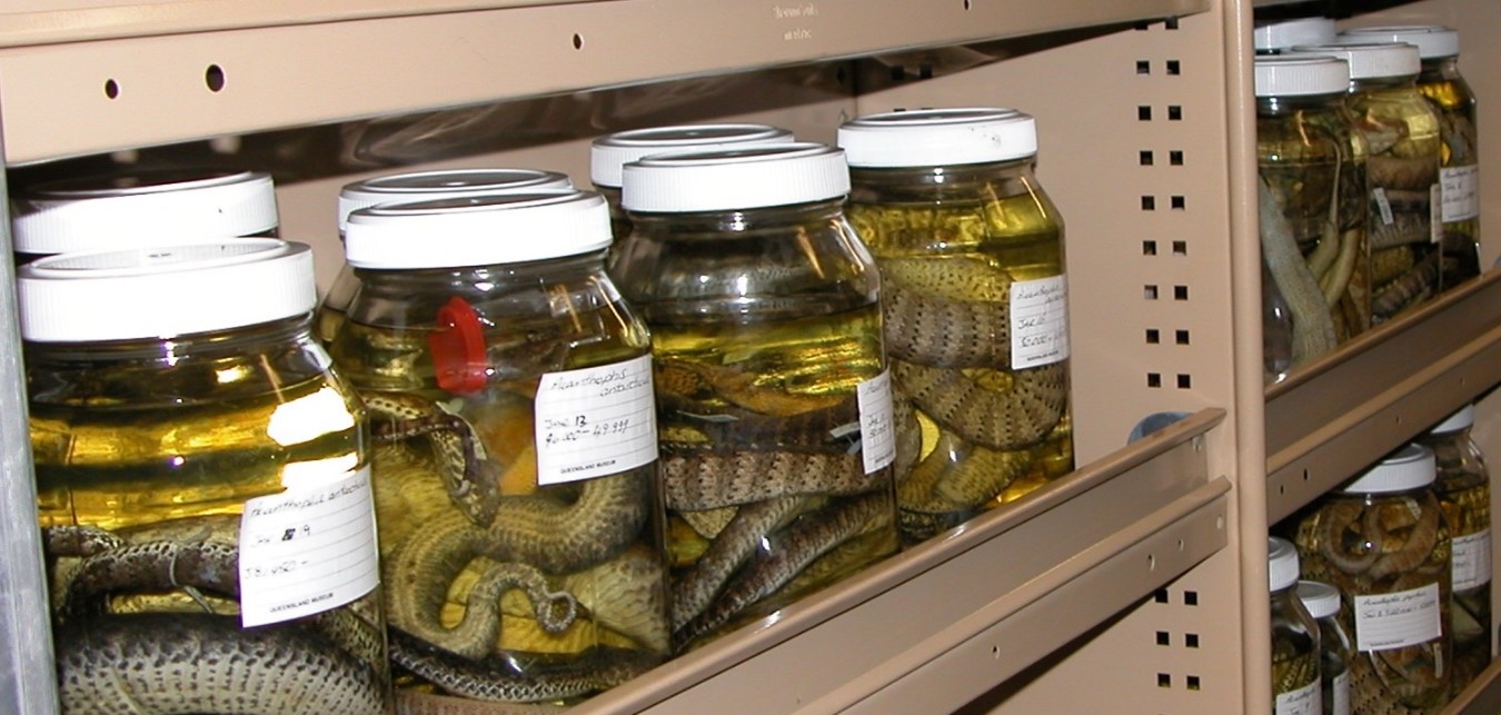 Jars containing whole, preserved Death Adders in the museum’s wet vertebrate collection.