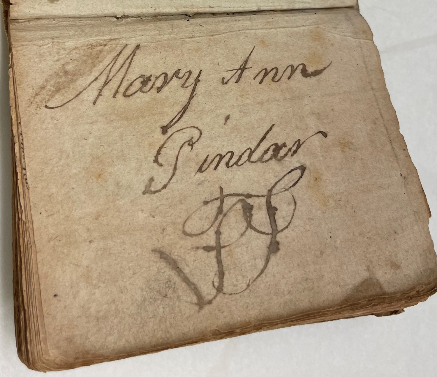 But the story waiting to be told starts with the inside front cover. There are three ink signatures on the first few pages. “Sarah Thorpe 31st January 1797”, “Ann Thorpe 20 January ‘97” and “Mary Ann Pindar(?)” Ann has claimed it first looking at the dates. We’re left to wonder if Mary Ann, who has had a different surname, is the daughter of Sarah or Mary Ann. There’s also the unknown history of how this tiny book travelled from London in 1797 to Brisbane in 1924, the year it was registered in the library collection.