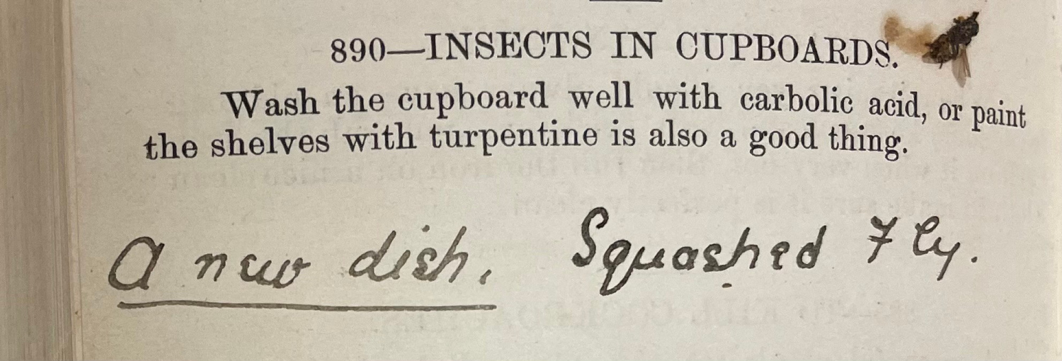 Working with old books, especially ones that were heavily utilised as reference books, means you’ll come across handwritten annotations in margins and blank pages. The published narrative is ever evolving. The funniest example so far is within the 1898 Townsville publication Mrs. Maclurcan’s cookery book : a collection of practical recipes specially suitable for Australia[3]. Hannah Maclurcan’s book extended to household tips, including how to manage insects in the cupboard. This page, coincidentally (or not?), has a squished fly, left in the book with the annotation “A new dish, Squashed Fly”