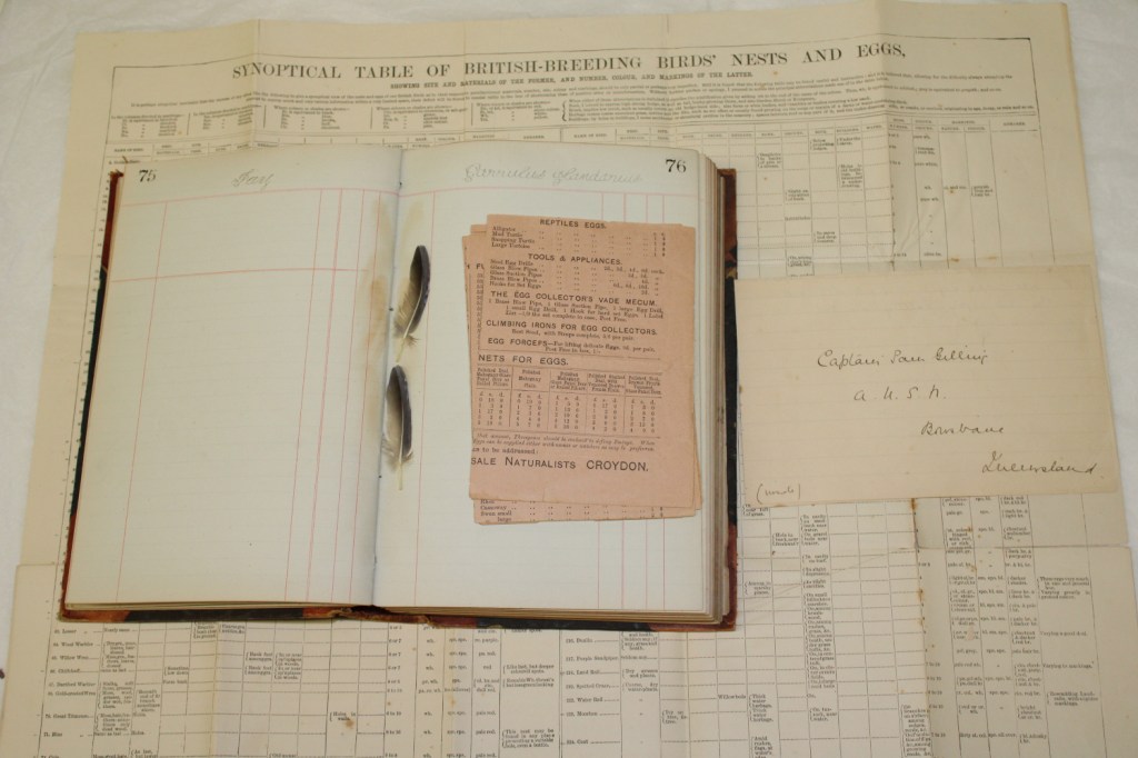 The Queensland Museum Library also has unpublished manuscripts in the rare book collection, some of which are handwritten diaries. One of these is a journal circa 1890, belonging to Captain Samuel Gilling (A.U.S.N), in which he lists birds and eggs and the dates seen. It’s also accompanied by a letter from his sister to him alongside a chart of British nesting birds, correspondence and newspaper clipping. A lovely surprise in the journal is on page 76, where Gilling has placed 2 small feathers.