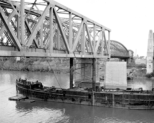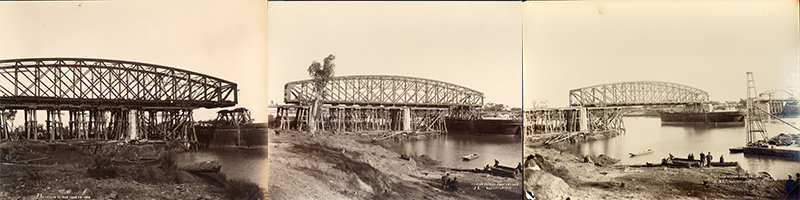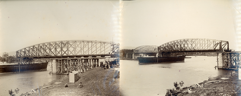 The span built on the north bank was moved into positioned on 14 June 1899. Trollies were placed beneath each end of the girders and the span was rolled out 60 feet (18.3m) over the river until it was above the Jennie Parker. Photographer: Henry Goode. Queensland Museum Network Collection