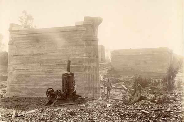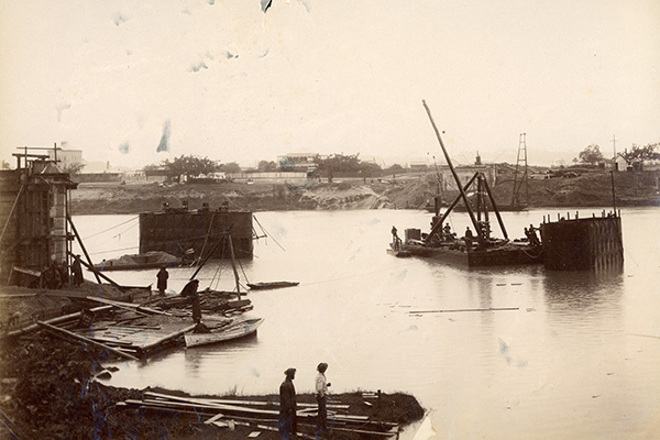 A caisson is a prefabricated hollow box sunk into the ground to form a foundation for the bridge. Once each caisson was sunk to the required depth, varying from 10 to 14 feet (3m to 4.2m), they were filled with Portland cement and then built up to create a pier of the required height. Queensland Rail Historical Archive / Photographer: Henry Goode. Queensland Museum Network Collection