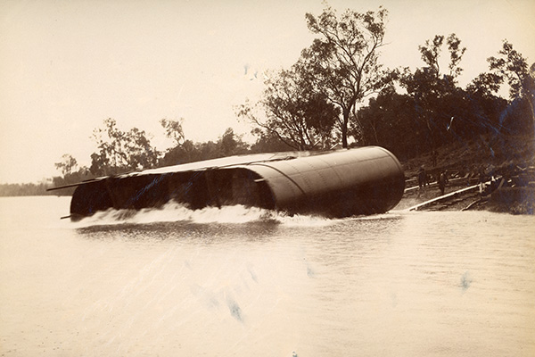 The caissons for the Alexandra Bridge were launched on their sides, rather than the bottom entering the water first. It was the belief of Mr HJ Beatty, manager for the contractor George Willcocks, that the weight of the caisson would right itself as soon as it was in deep water – which it did.