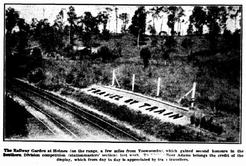 Queensland Railways staff took to their gardens with great enthusiasm. Staff gardeners decorated their platforms with floral designs. Union Jacks, crests, the name of the station and even catch phrases were fashioned from plants and flowers. Holmes Station, on the Toowoomba range, won the first competition in 1914 and was a regular winner into the 1930s. Several stations from the Toowoomba region became well known because of their beautiful gardens decades before the city became famous for the Carnival of Flowers.